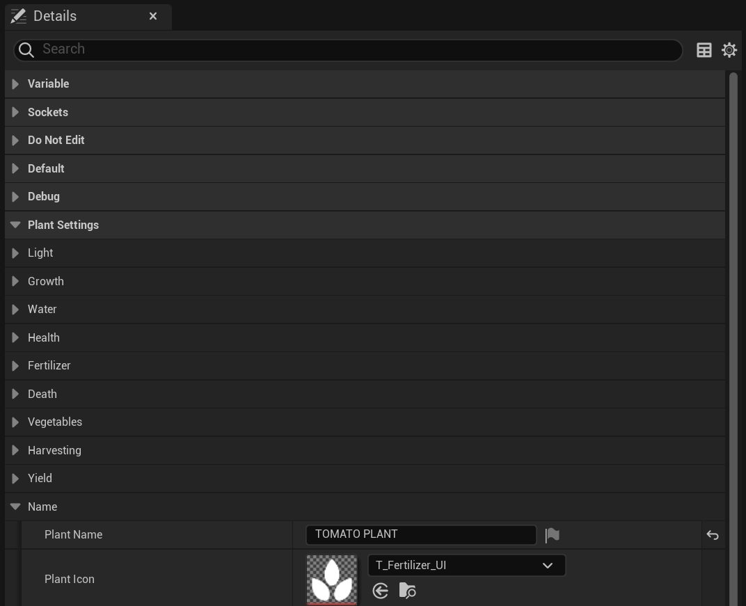 To change a plants name settings go to the plants blueprint so for example the BP_TomatoPlant and select the BP_PlantComponent in the Components panel, then in the Details panel and inside the Plant Settings Category find the Name category like the image below.