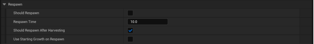 To change a plants Respawn settings go to the plants blueprint so for example the BP_TomatoPlant and select the BP_PlantComponent in the Components panel, then in the Details panel and inside the Plant Settings category find the Respawn category like the image below.