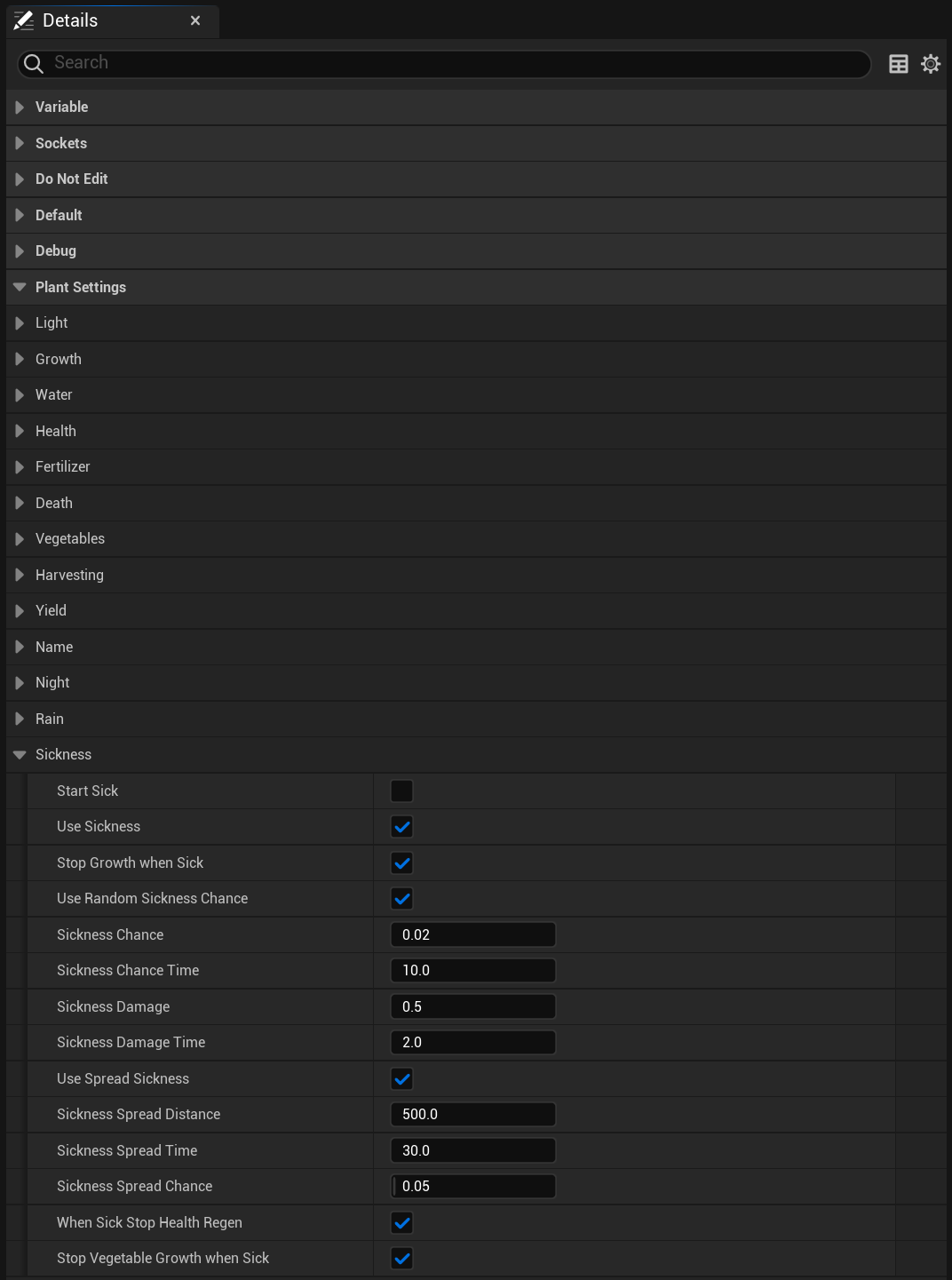 To change a plants Sickness settings go to the plants blueprint so for example the BP_TomatoPlant and select the BP_PlantComponent in the Components panel, then in the Details panel and inside the Plant Settings Category find the Sickness category like the image below.