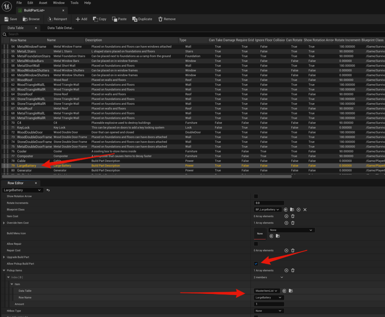 Then in the build part list you need to make sure you set the same item as the pickup item in for your battery build part and tick on Allow Pickup build Part.