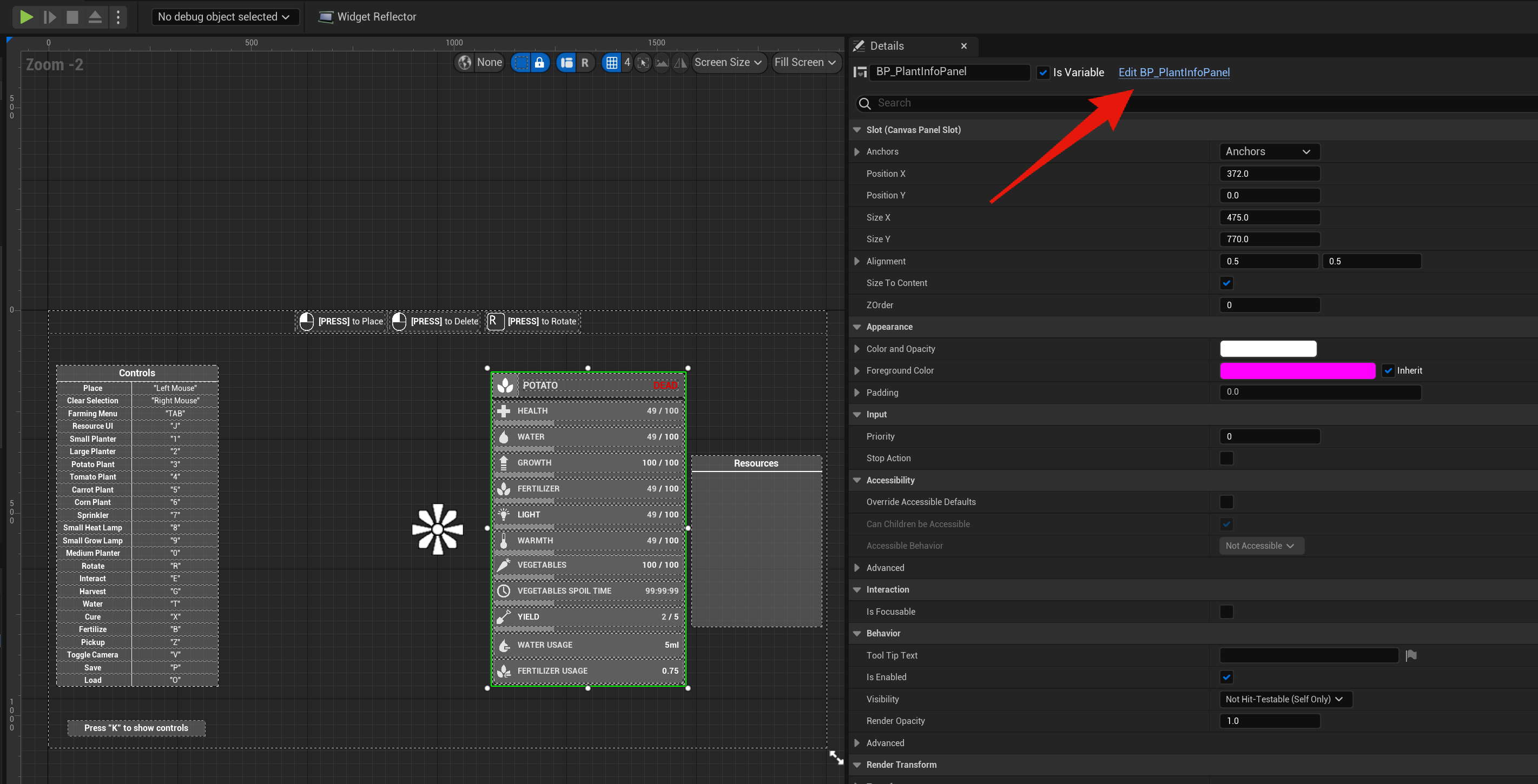 The main HUD widget for the farming system is the BP_FarmingHUD found in the widgets folder. Here you can change the location of UI elements, resize and customize how the UI looks.
