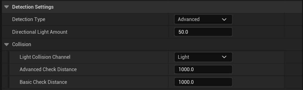 Next go to the BP_LightDetectorComponent then go to the Class Defaults and find the settings shown in the image below, make sure these settings are the same in your project.