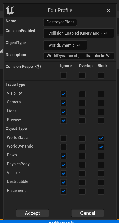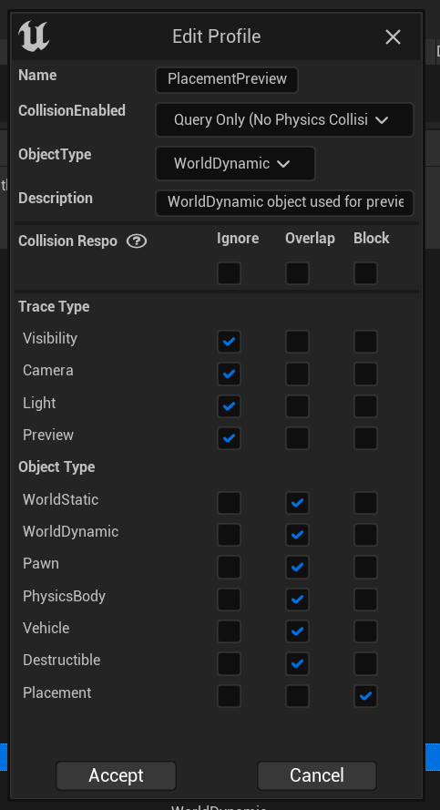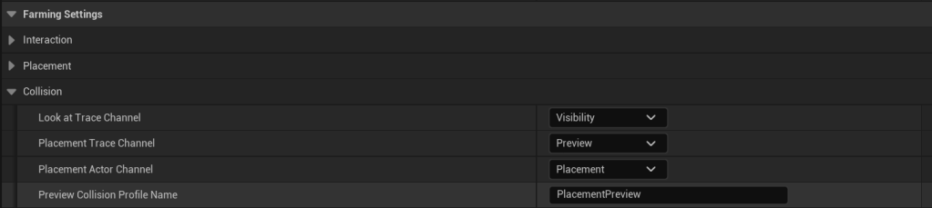 Below are important collision settings you need for Player Farming System to work correctly, if you migrated the it to another project or have made modifications to the collision settings you may be missing or have an incorrect setting. You may already have some settings set correctly but other might not be so its worth quickly going though and checking all these settings if you are having issues with the placement.