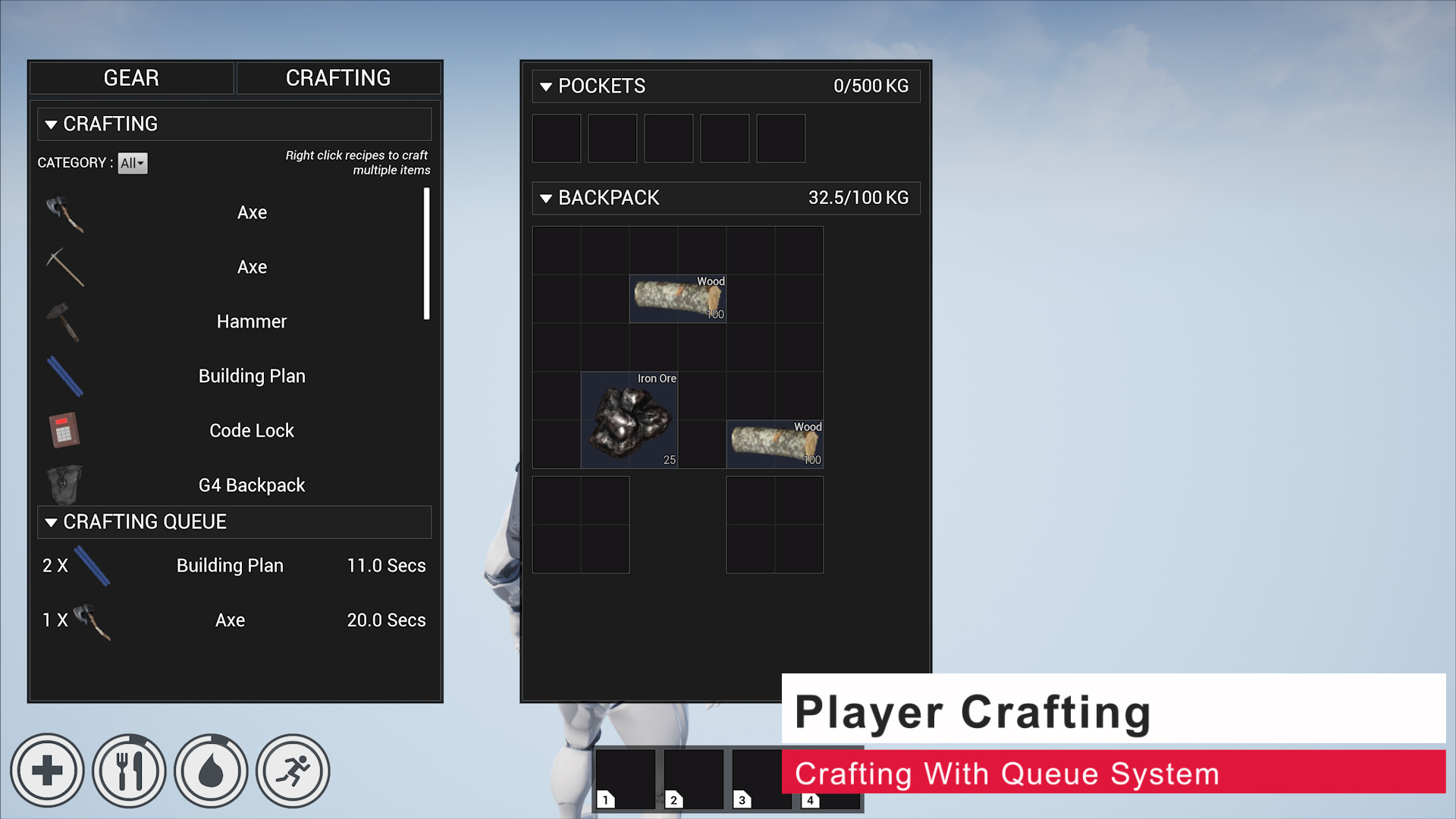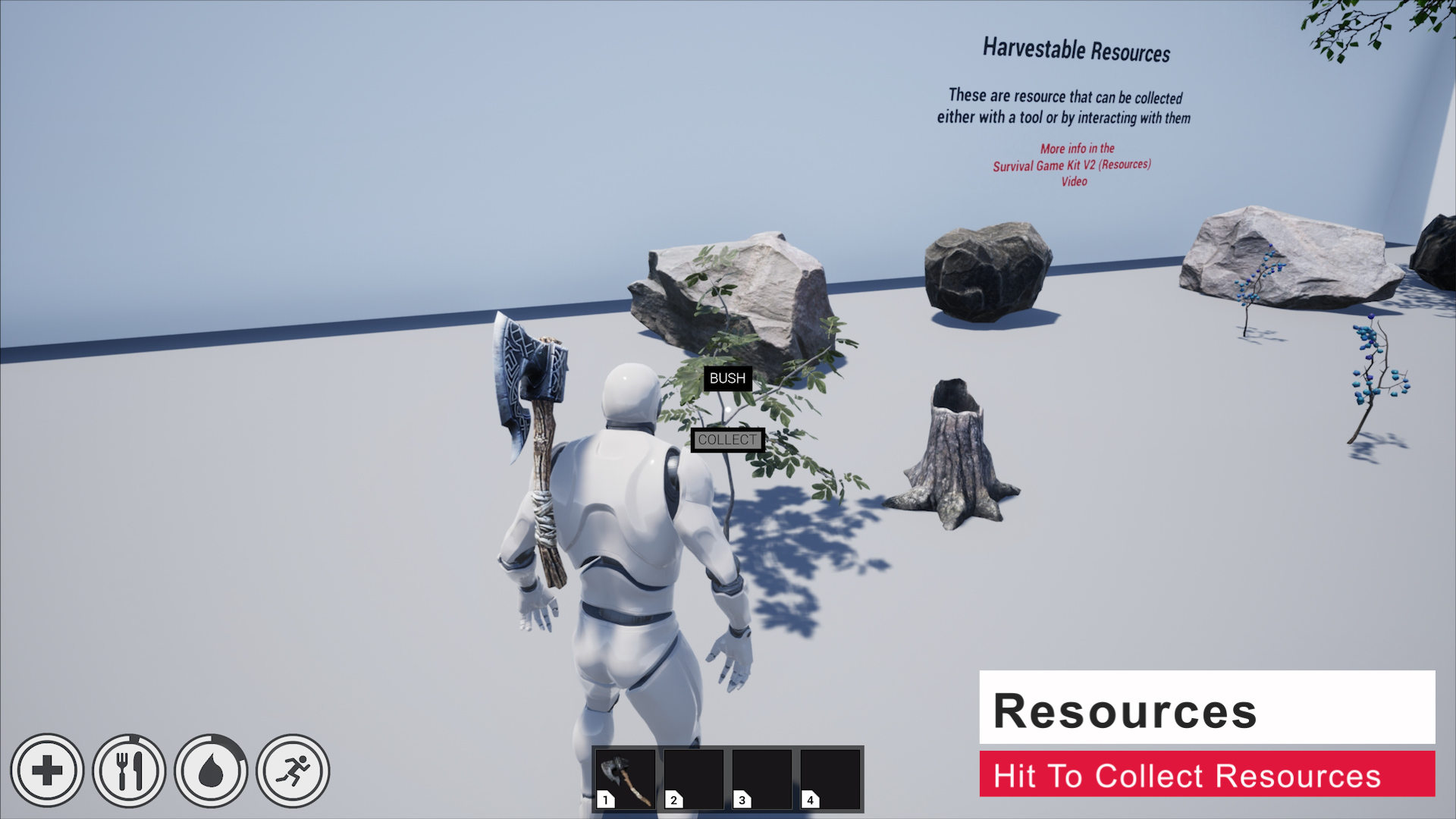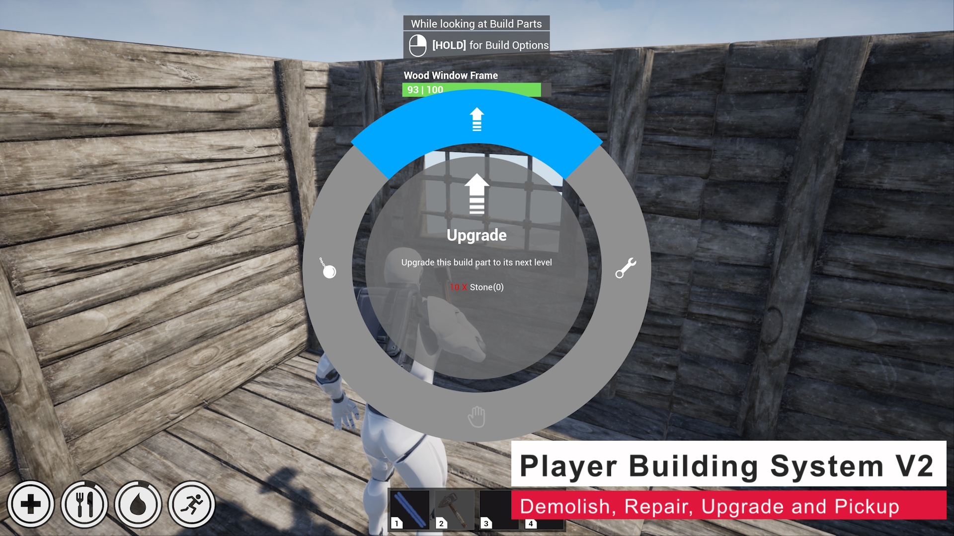 Survival game kit V2 brings all the features of the original with massive changes like a “Jigsaw” style inventory system, projectile based weapons and a full main menu and in game menu system just to name a few. V2 also includes Player Building System V2 a brand new player building system built from scratch for the needs of new modern survival games.