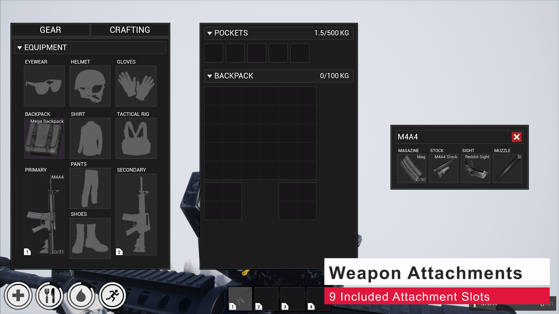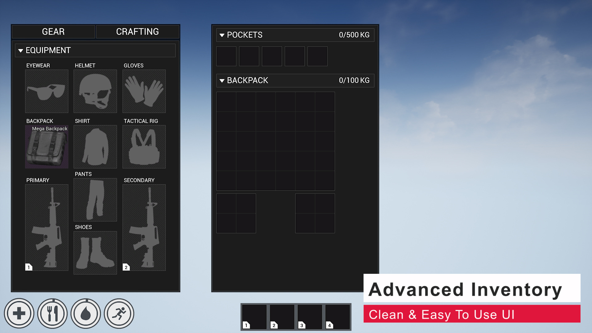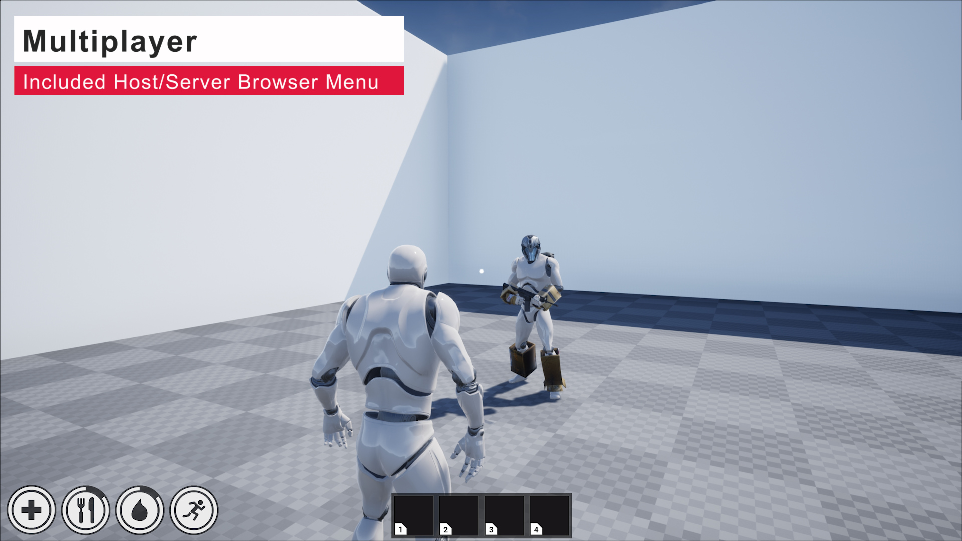 Survival game kit V2 brings all the features of the original with massive changes like a “Jigsaw” style inventory system, projectile based weapons and a full main menu and in game menu system just to name a few. V2 also includes Player Building System V2 a brand new player building system built from scratch for the needs of new modern survival games.
