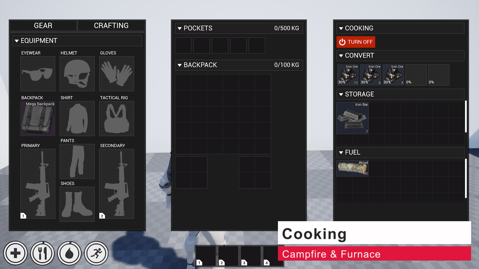 • Campfire, Crafting Bench, Wood Chest, Vendors, Furnace & Bed (Respawn Point)