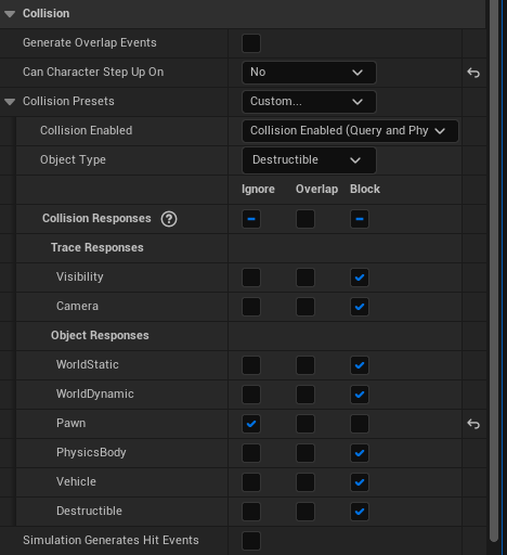 Then with the GeometryCollection still selected in the Components panel find the collision settings and set them like the image below. Then save the blueprint.