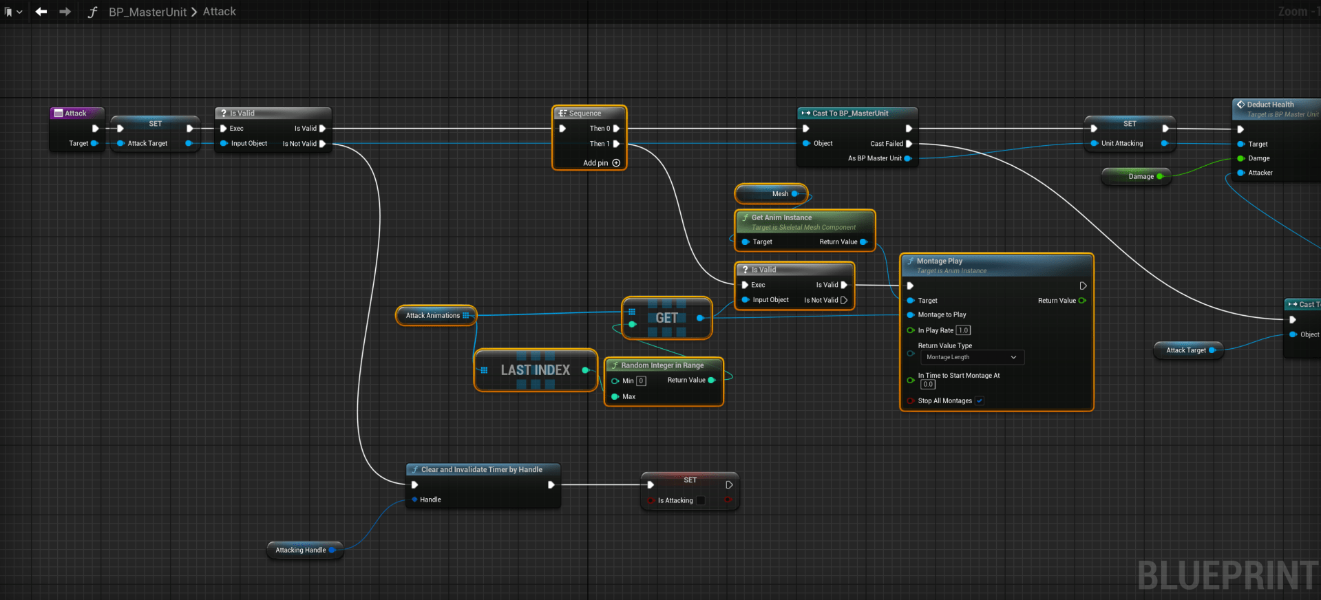 Next open the BP_MasterUnit and create a new variable called AttackAnimations and set its type to AnimMontage, then tick on Instance Editable and set the variable to an Array. Then go to the Attack function and copy the image below by adding the highlighted nodes.