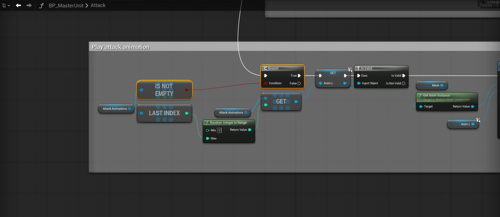 RTS Template – Fixed Attack Anims Not Working With 1 Anim Set Go to the BP_MasterUnit then open the Attack function and copy the image below to fix that.