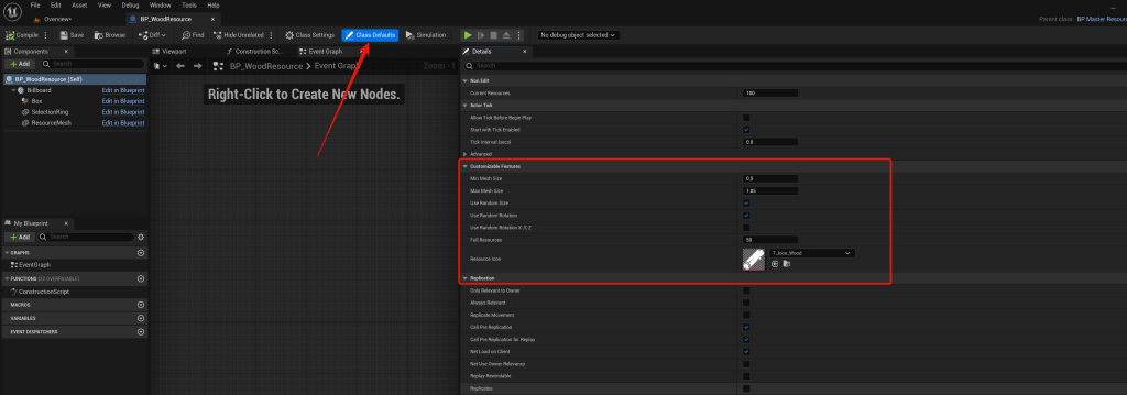 In the resource blueprint you can change settings such as the random sizes of the mesh and resource amounts. This can be found in the Class Defaults of the resource blueprint like in the image below of the BP_WoodResource.