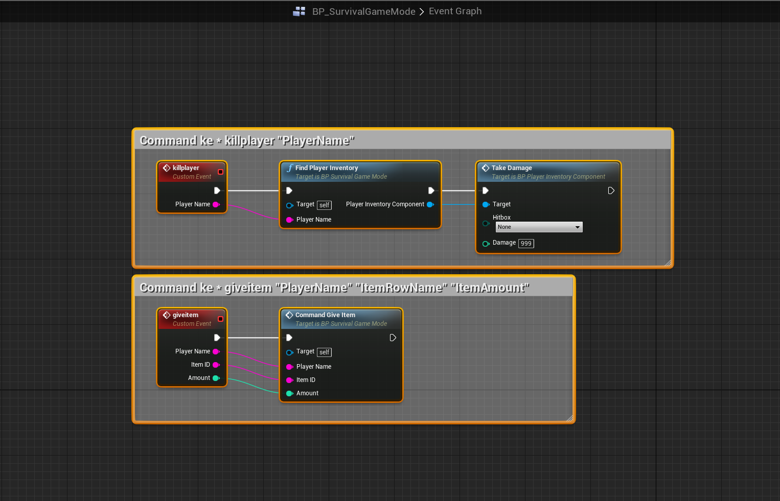 Next in the BP_SurvivalGameMode event graph add the highlighted nodes shown in the image below. You will need to create 2 new custom events called giveitem and killplayer.