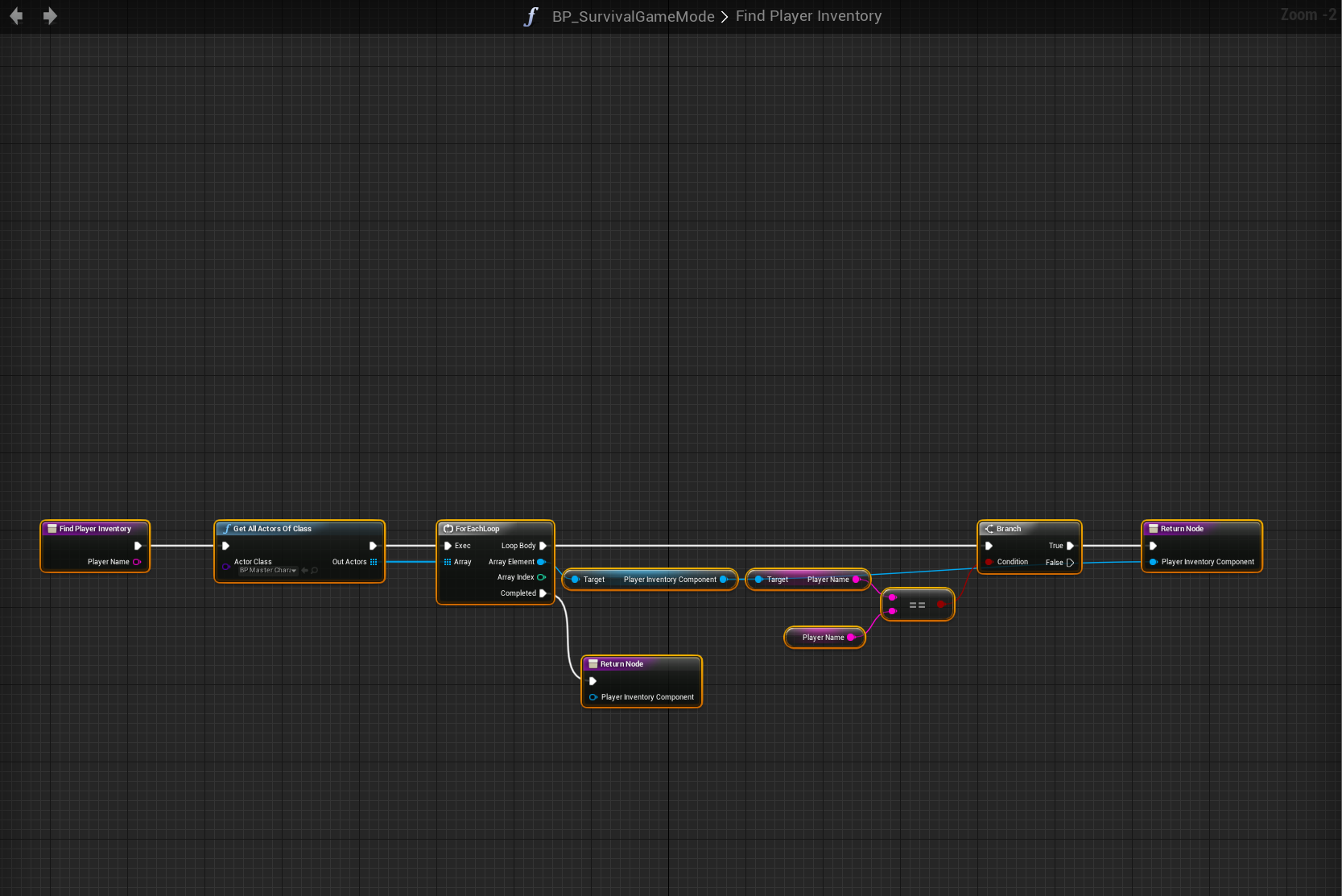 Next go to the BP_SurvivalGameMode and create a new function called FindPlayerInventory. Add a new input variable type String and call the input PlayerName. Then add an output called PlayerInventoryComponent and set the variable type to BP_PlayerInventoryComponent then copy the image below.
