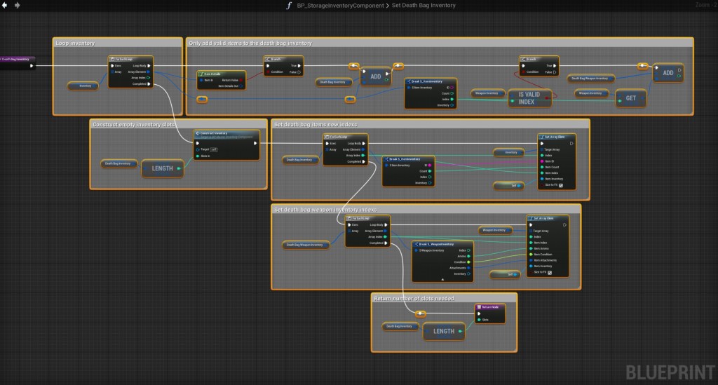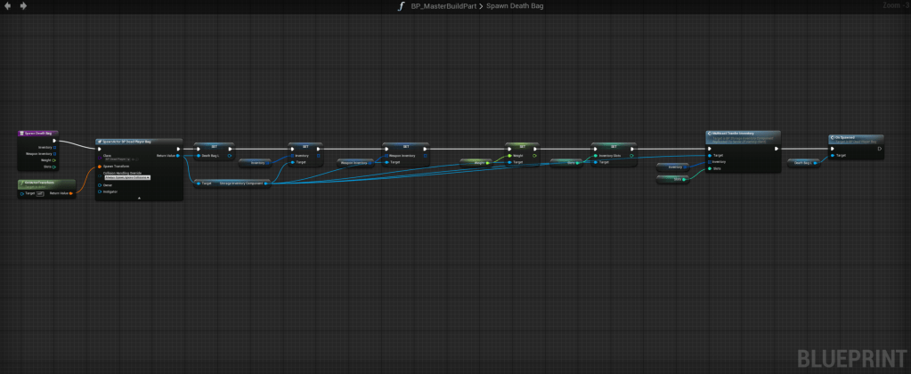 Next create a new function in the BP_MasterBuildPart called Spawn Death Bag. Add the same inputs listed above and open the function. Next copy the image below.