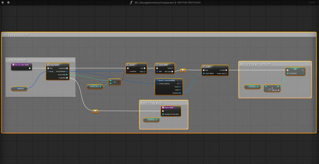 Next go to the BP_StorageInventoryComponent and create a new function called Get Free Slot Count and copy the image below. The variable Free Slots L is a local variable that you will need to create.