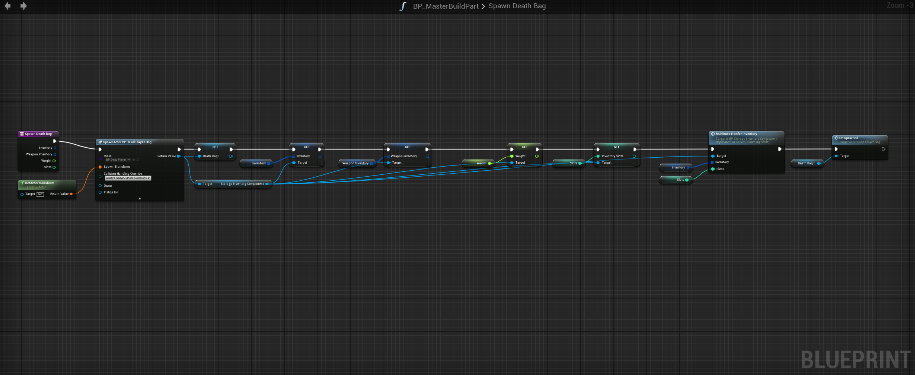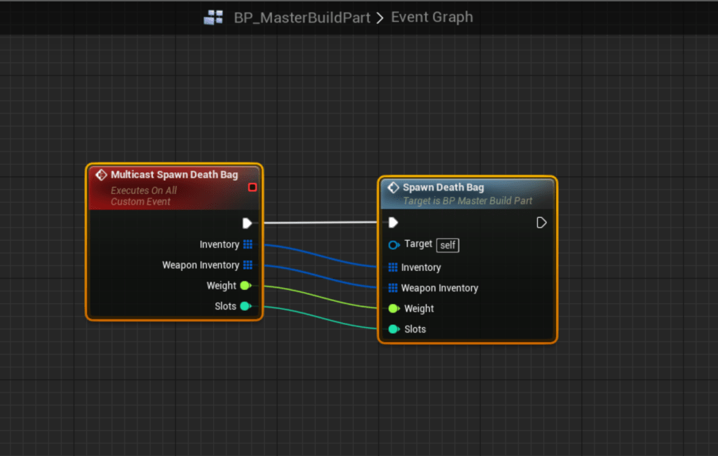 Go to the BP_MasterBuildPart and create a new custom event called Multicast Spawn Death Bag set it to multicast with reliable ticked and add the following inputs.