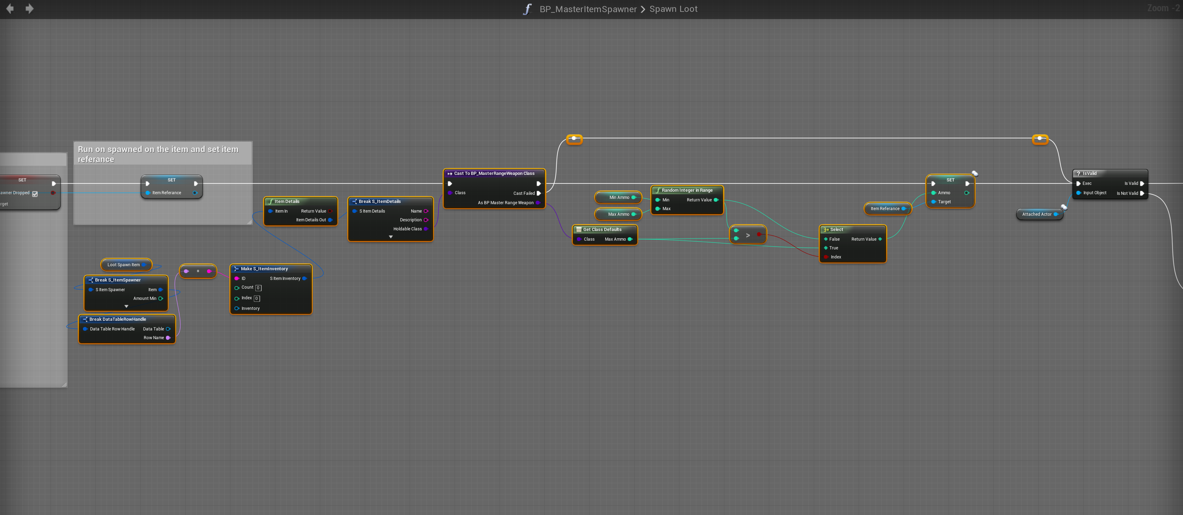 Go to the BP_MasterItemSpawner and create 2 new integer variables one called Min Ammo and one called Max Ammo. Then tick Instance Editable for both.