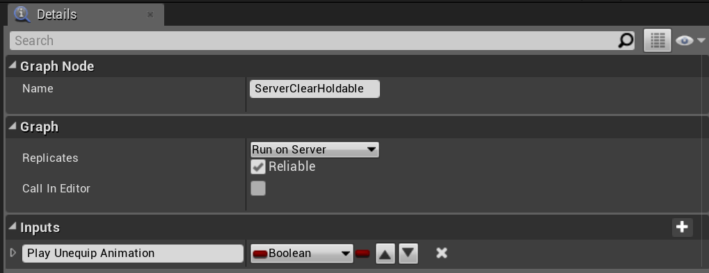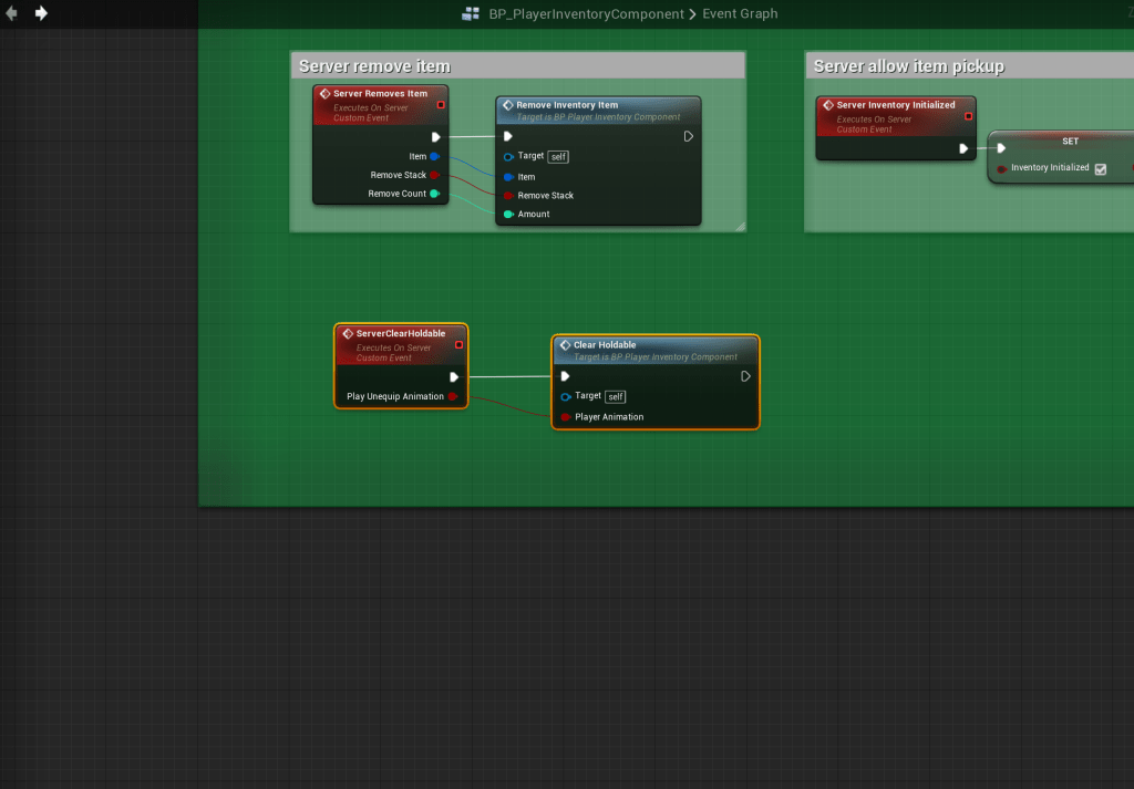 Next go to the event graph of the BP_PlayerInventoryComponent and create a new custom event, call it ServerClearHoldable and copy the settings for it from the image below.