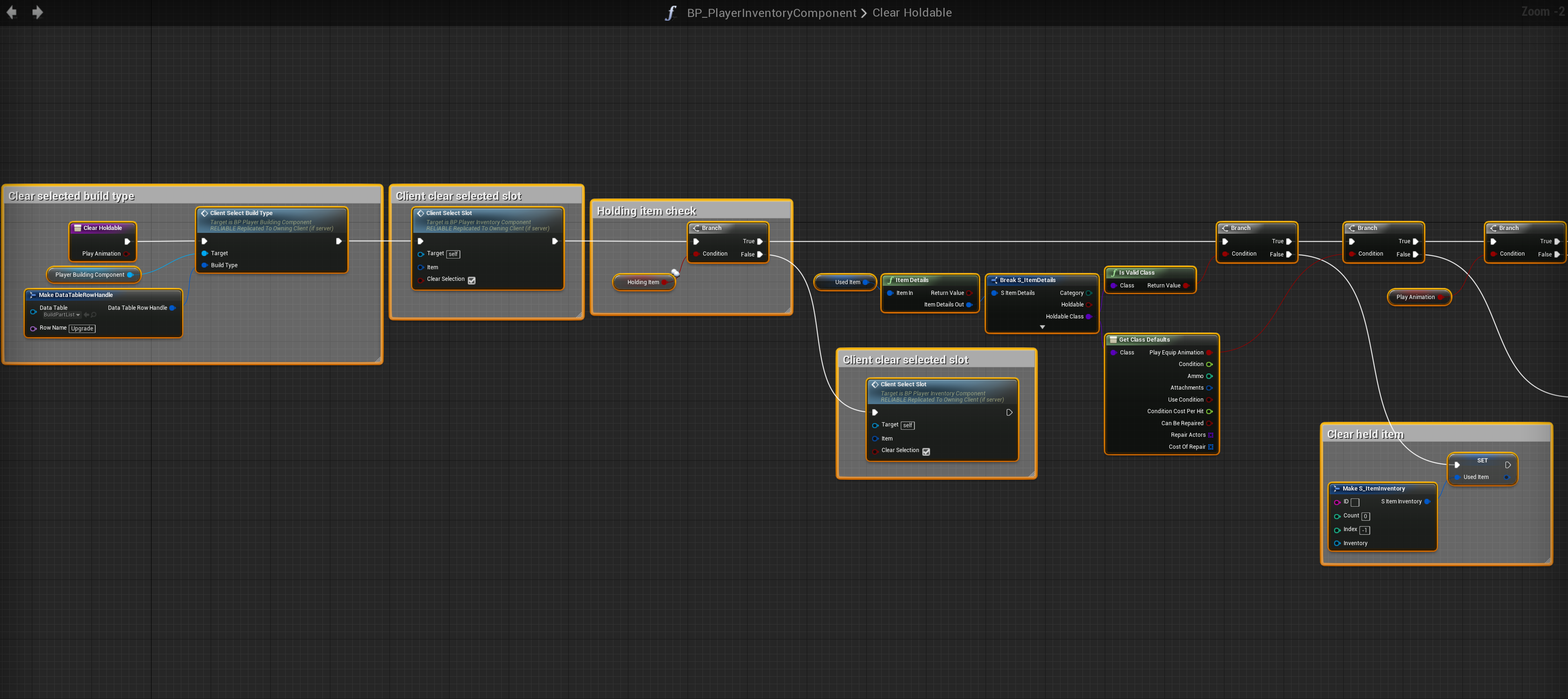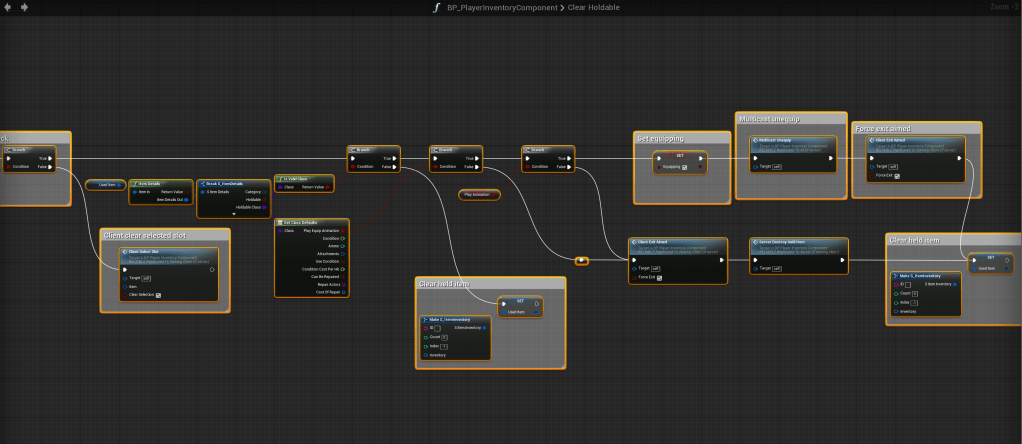 Go to the BP_PlayerInventoryComponent and create a new function called Clear Holdable and add an input called Play Animation and set its variable type to Bool.