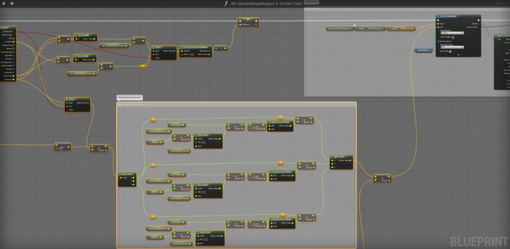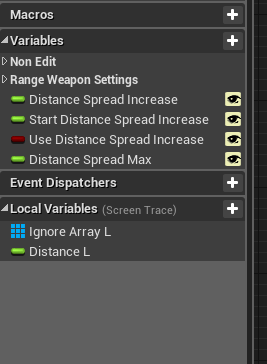 Go to the BP_MasterRangeWeapon then to the Screen Trace function. Then create 4 new variables and 1 new local variable.