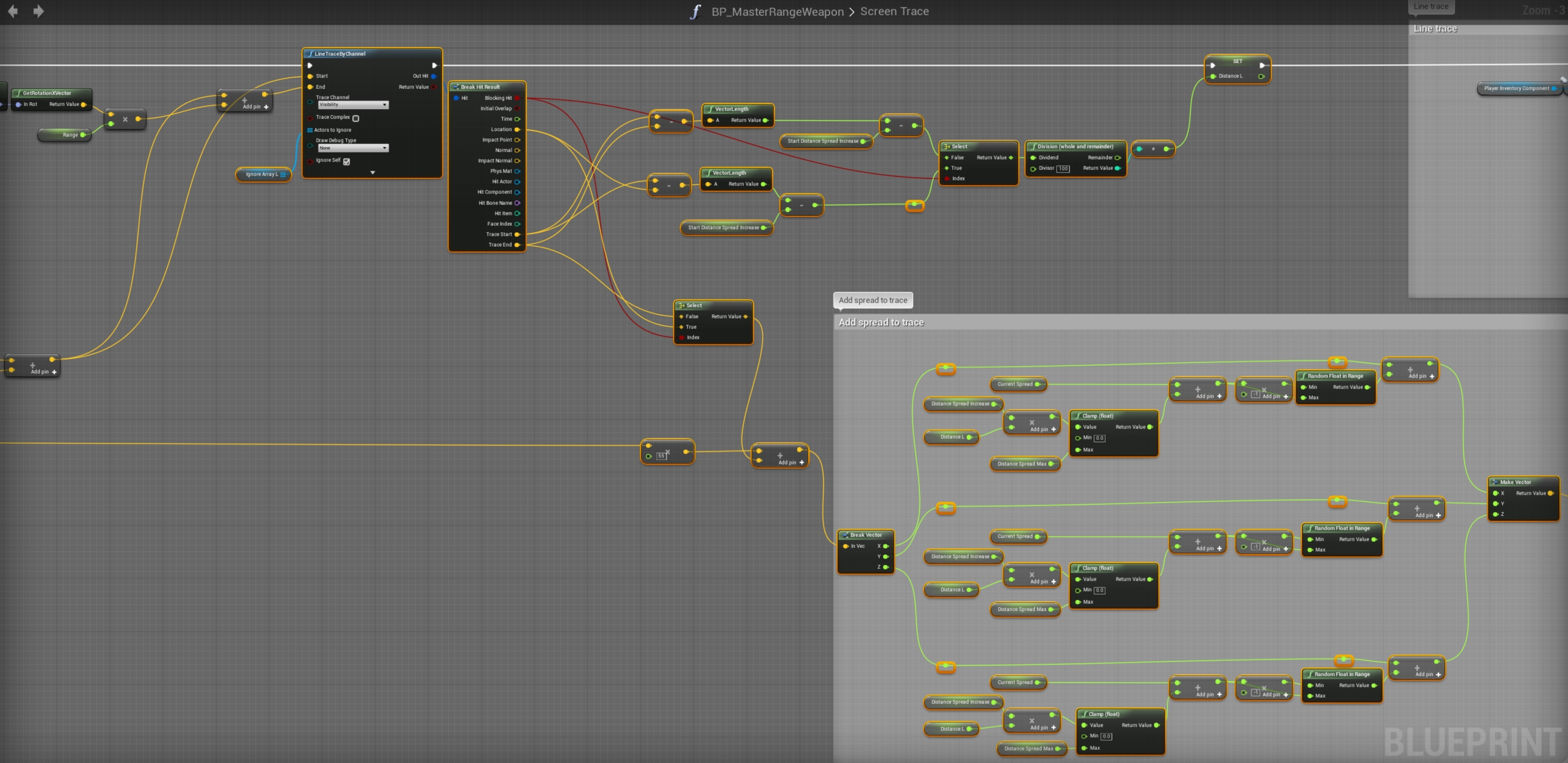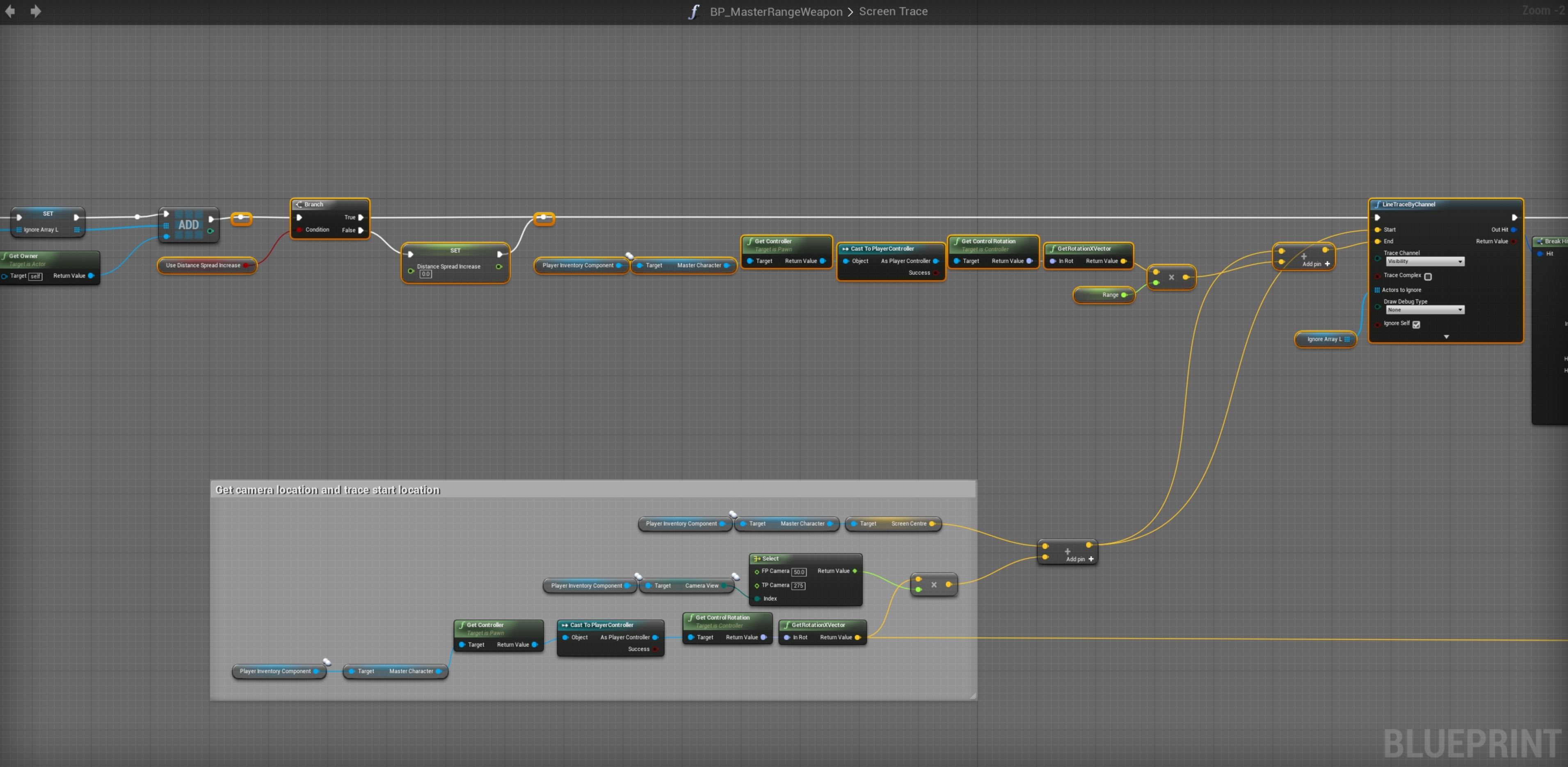 Go to the BP_MasterRangeWeapon then to the Screen Trace function. Then create 4 new variables and 1 new local variable.