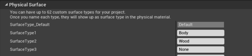 First go to you project settings, then to the physics category. The scroll down to the physics surface list, here you can add new surface types for materials like wood metal stone etc. Start by changing the first None surface type to the name of your surface for this guide we will use wood. So it should look like the image below.