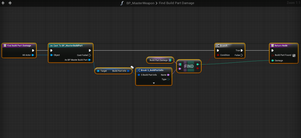 Next create a new function in the BP_MasterWeapon called Find Build Part Damage and set the inputs and outputs like the image shows below.