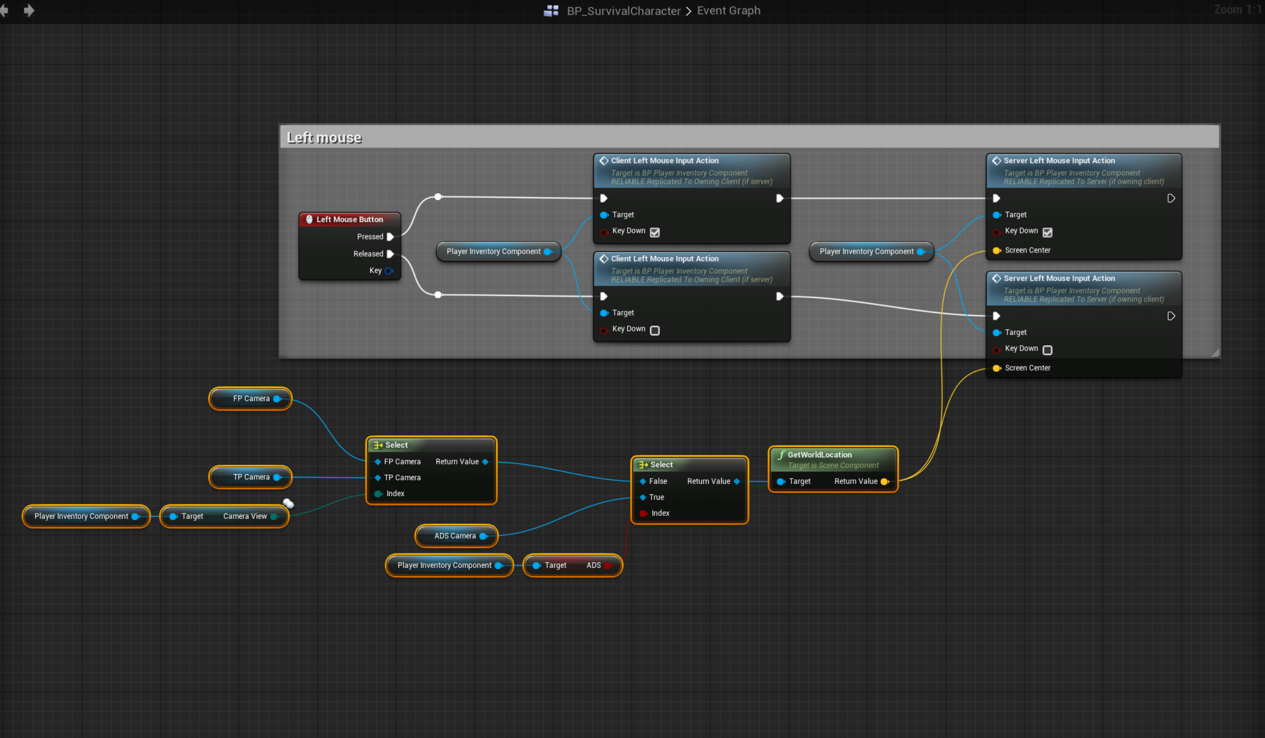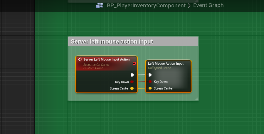 Next in the BP_PlayerInventoryComponent find the Server Left Mouse Input Action event select it and add a new input type vector called Screen Center. Like the image below