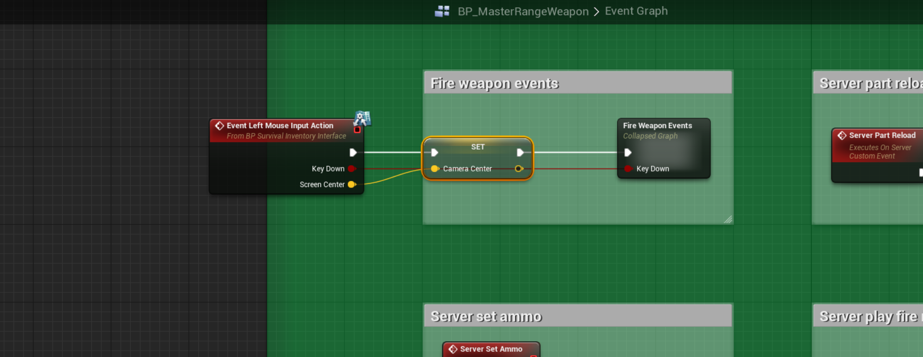 Then select the Left Mouse Action Input collapsed nodes next to that node and add a new input the same as the events one you just created and connect them up like shown below.