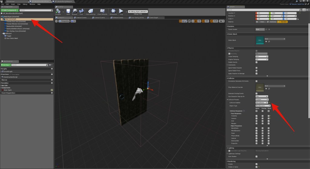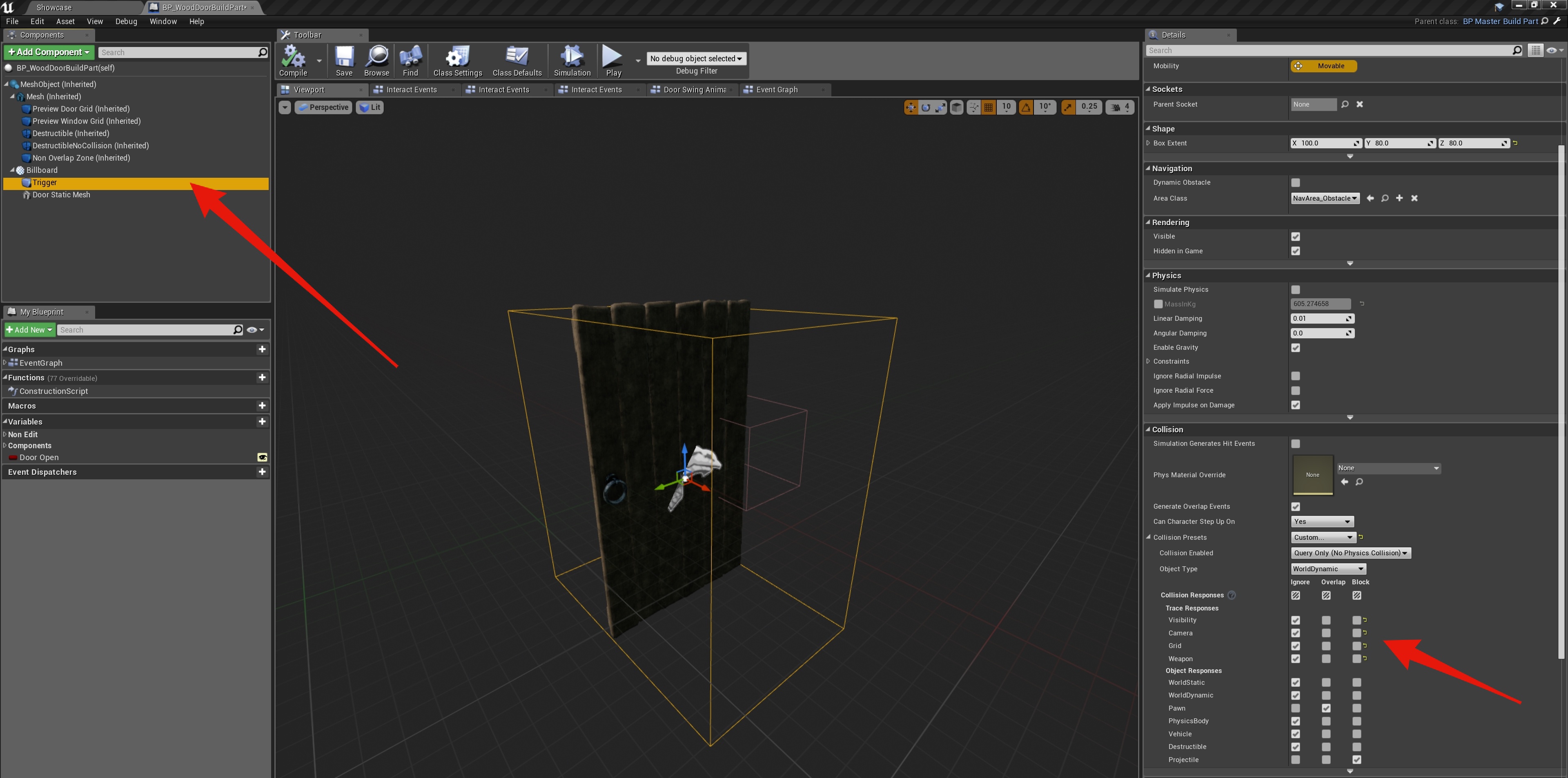 SGK – Fixed doors taking damage when open Open the BP_WoodDoorBuildPart then select the Trigger component and in the collision settings tick Ignore for both Weapon and Grid. Next select the Mesh (Inherited) then in the collision settings set the Collision Enabled to No Collision.
