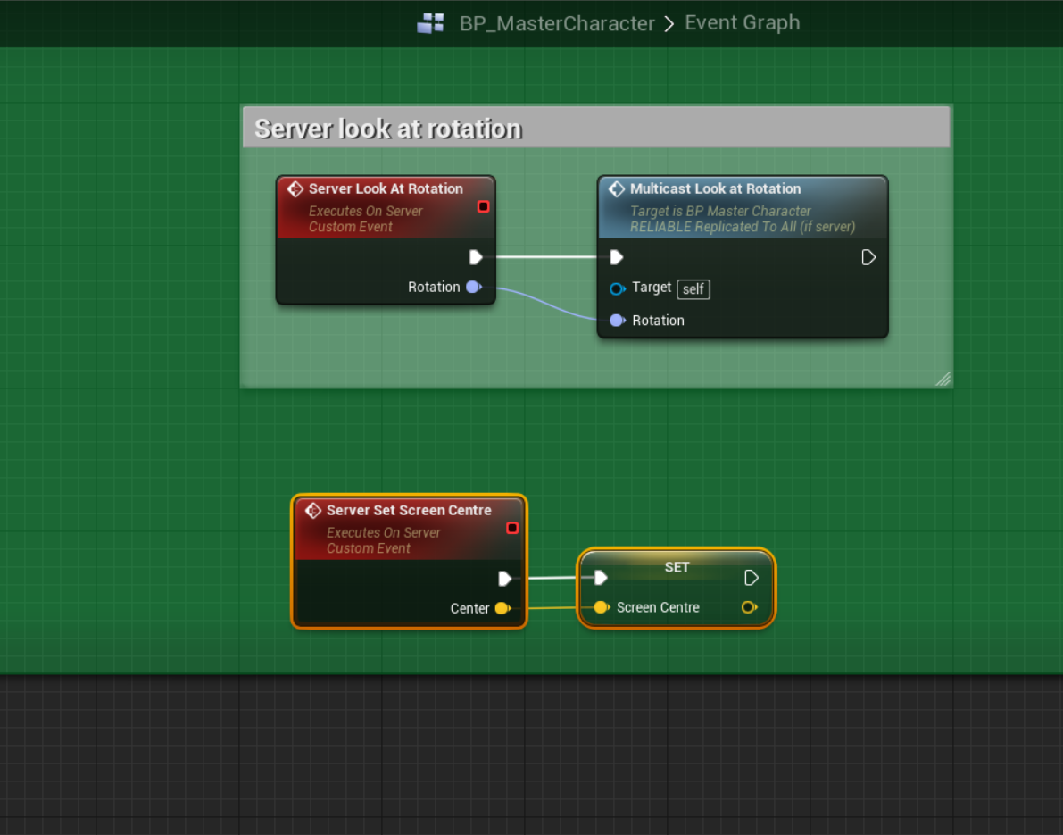 Then create a new event on the BP_MasterCharacter called “Server Set Screen Centre” and set it to Run On Server and tick reliable. Then add a new vector input on the event called centre.
