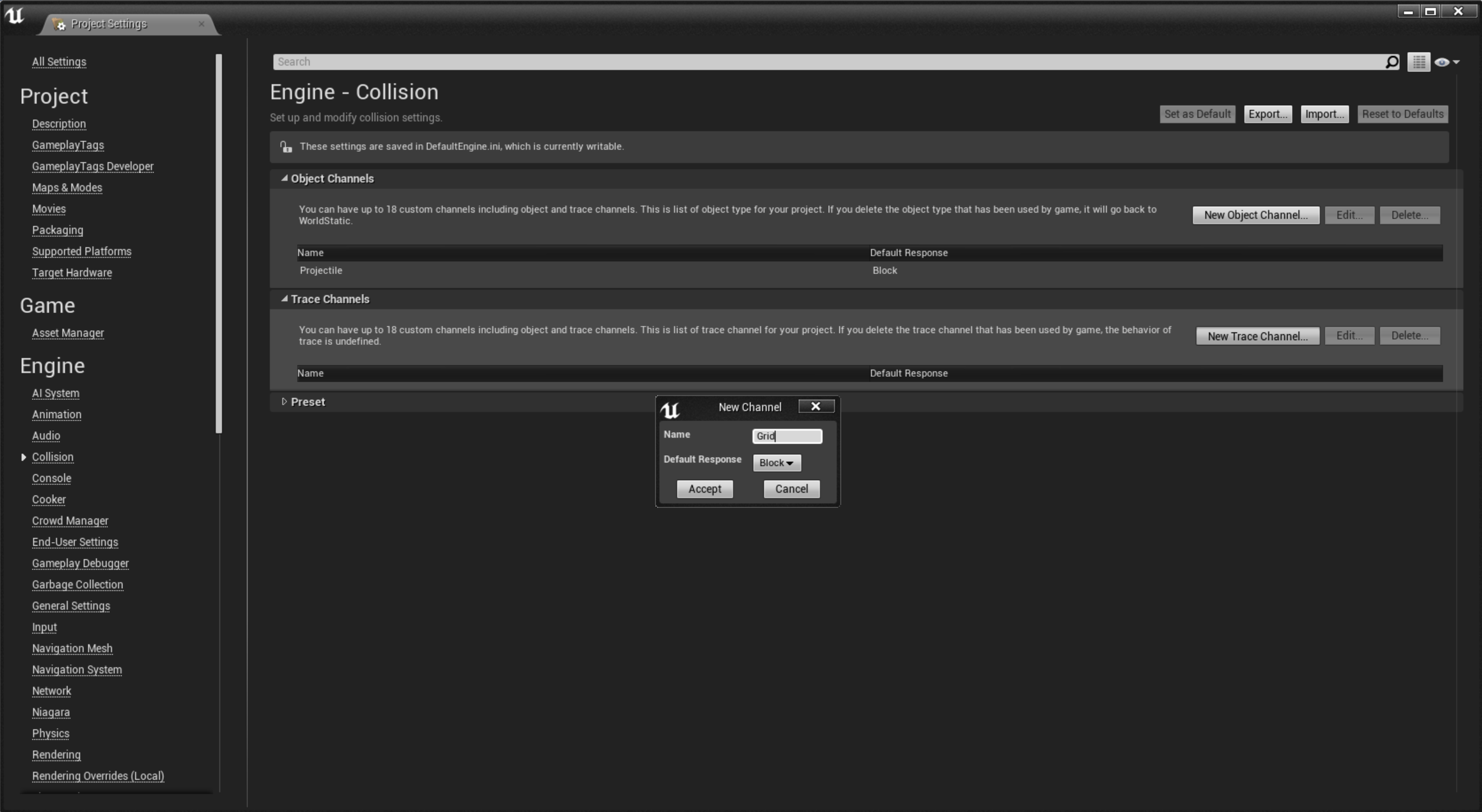 First go to your project settings, then to the collision category and press the New Trace Channel button. Name it Grid and press Accept. It should look like the image below.