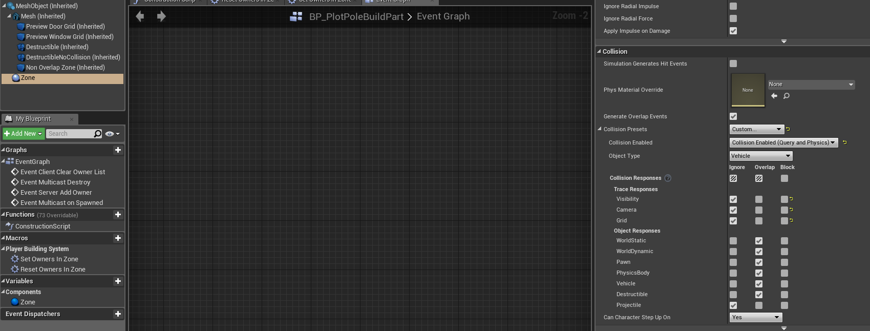 Next go and select the components in the components panel shown in the images and copy the collision settings shown in the details panel, If you do not see the tick bot options for the collision settings make sure you set the Collision Preset to custom. Location are in the centre of the event graph view.