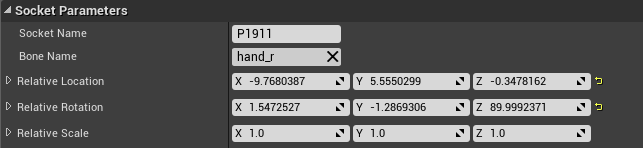 If you go to the UE4_Mannequin_Skeleton and select the P1911 socket and set the location and rotation like the image below.