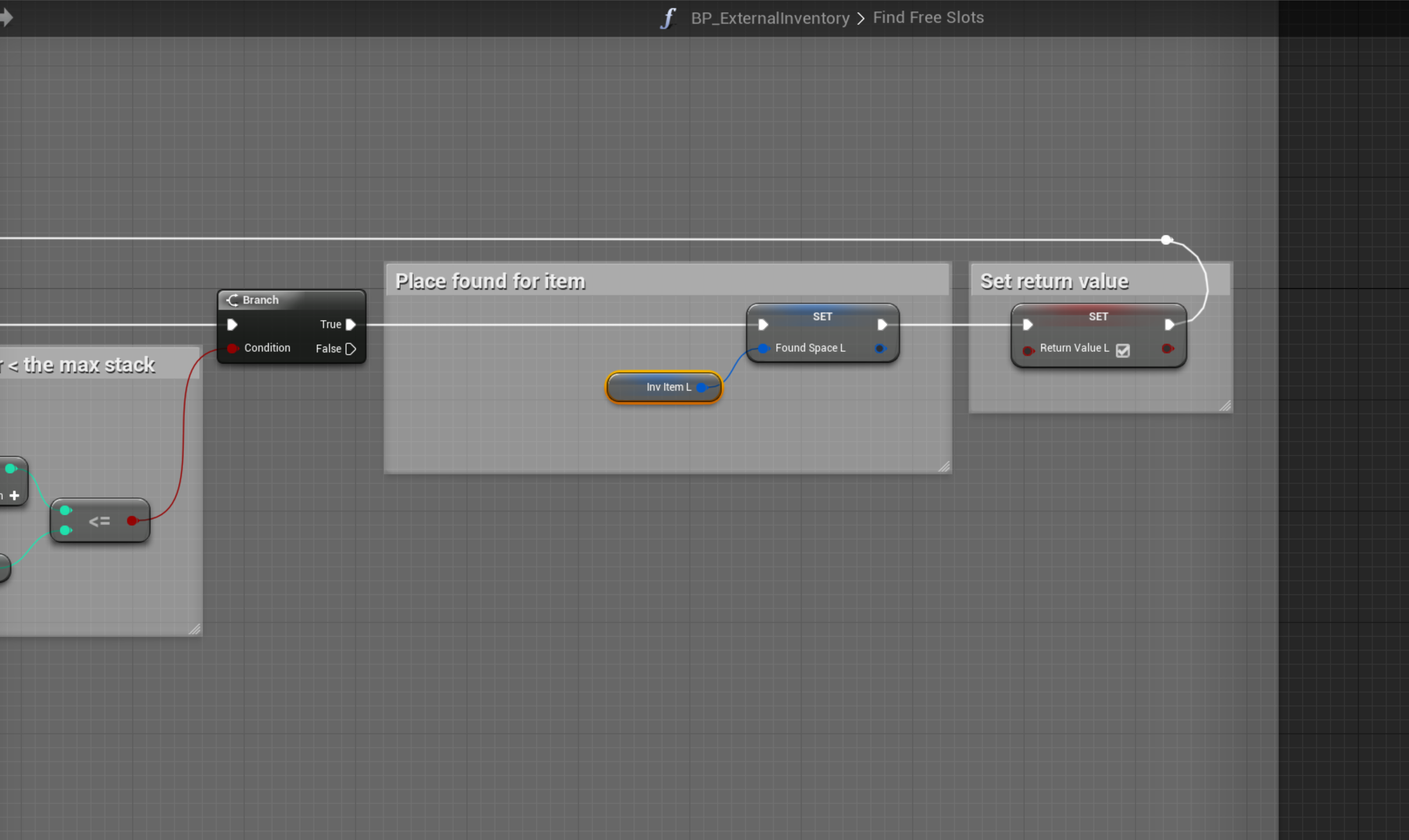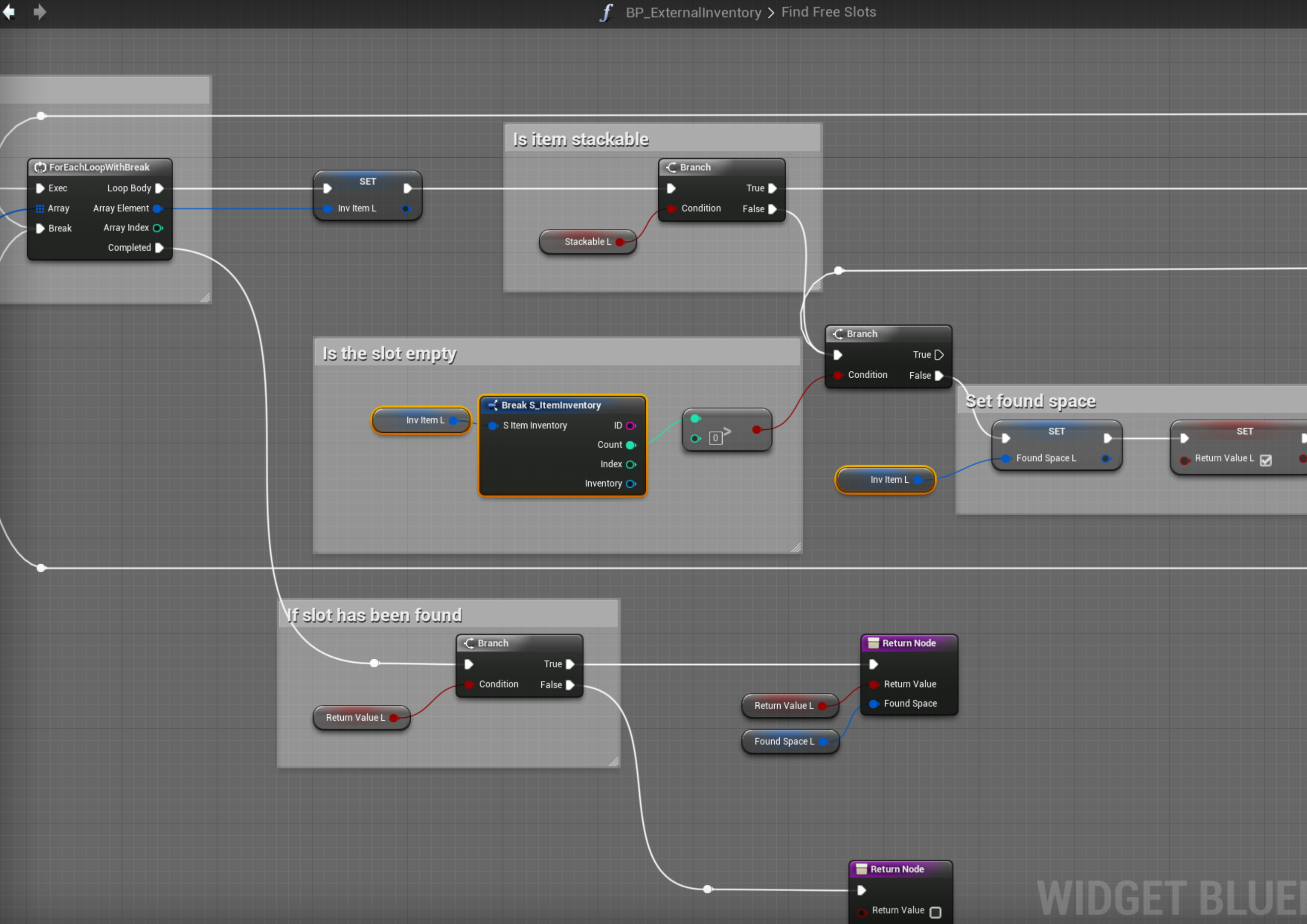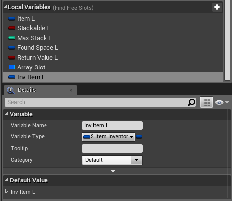 Navigate to the BP_ExternalInventory then to the Find Free Slots function. Create a new local variable called Inv Item L and set the variable type to S_ItemInventory like this image below.