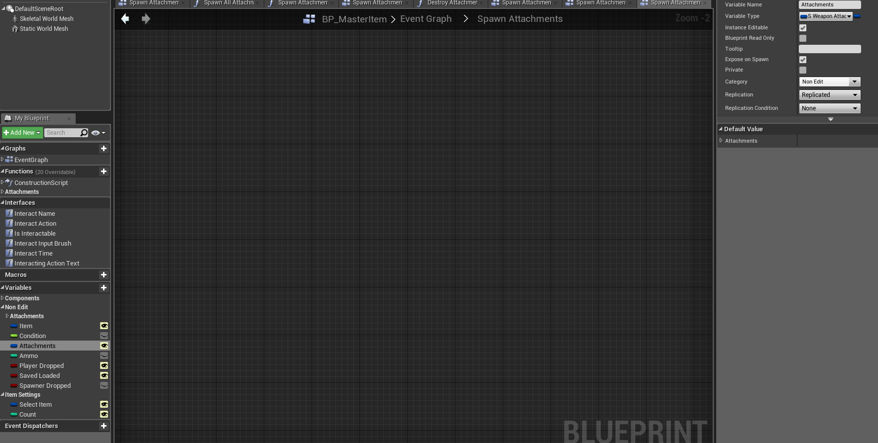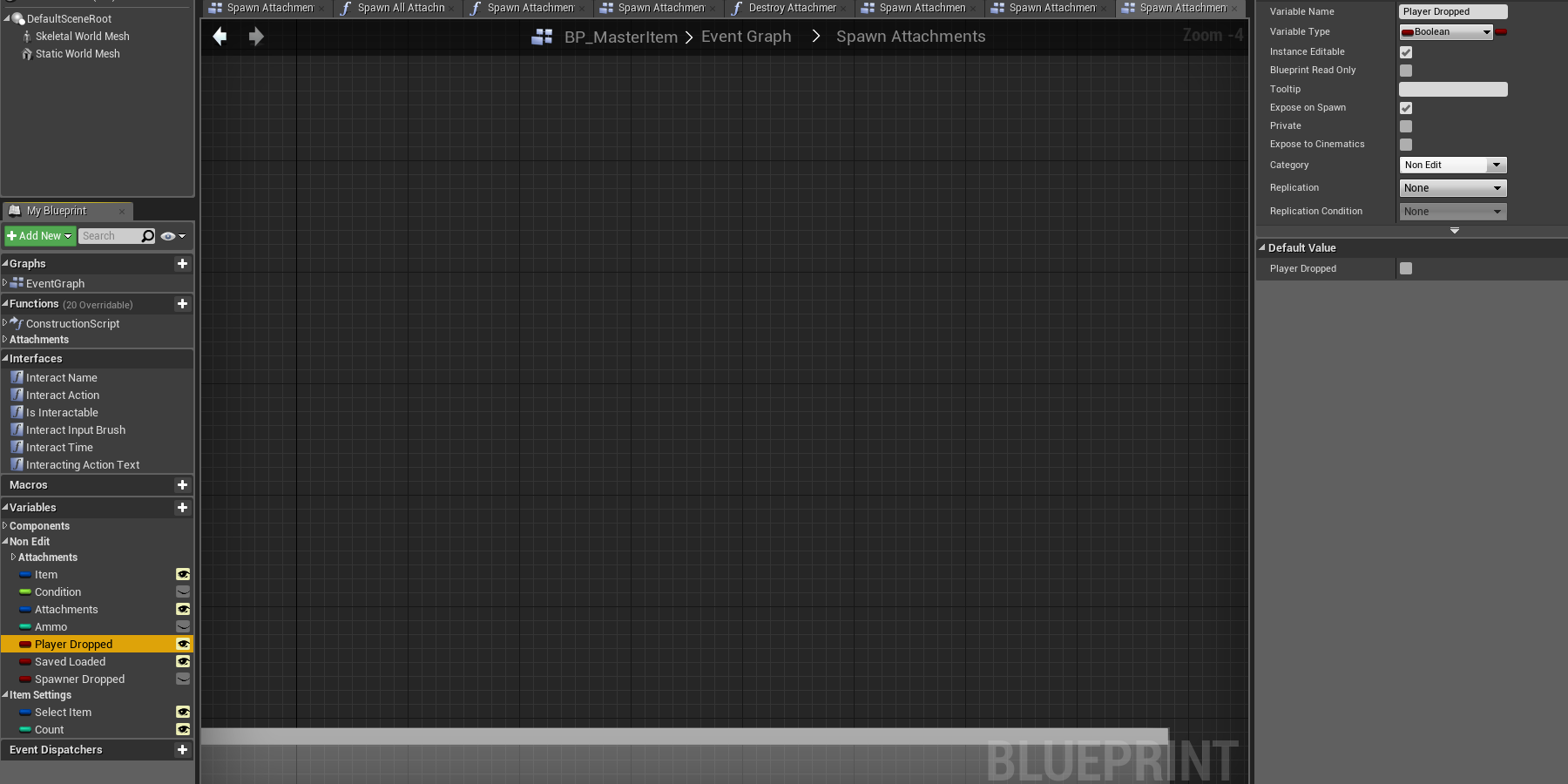 Go to the BP_MasterItem and Select the Attachments variable and tick the option expose on spawn, do the same for the Player Dropped variable. They should look like the images below