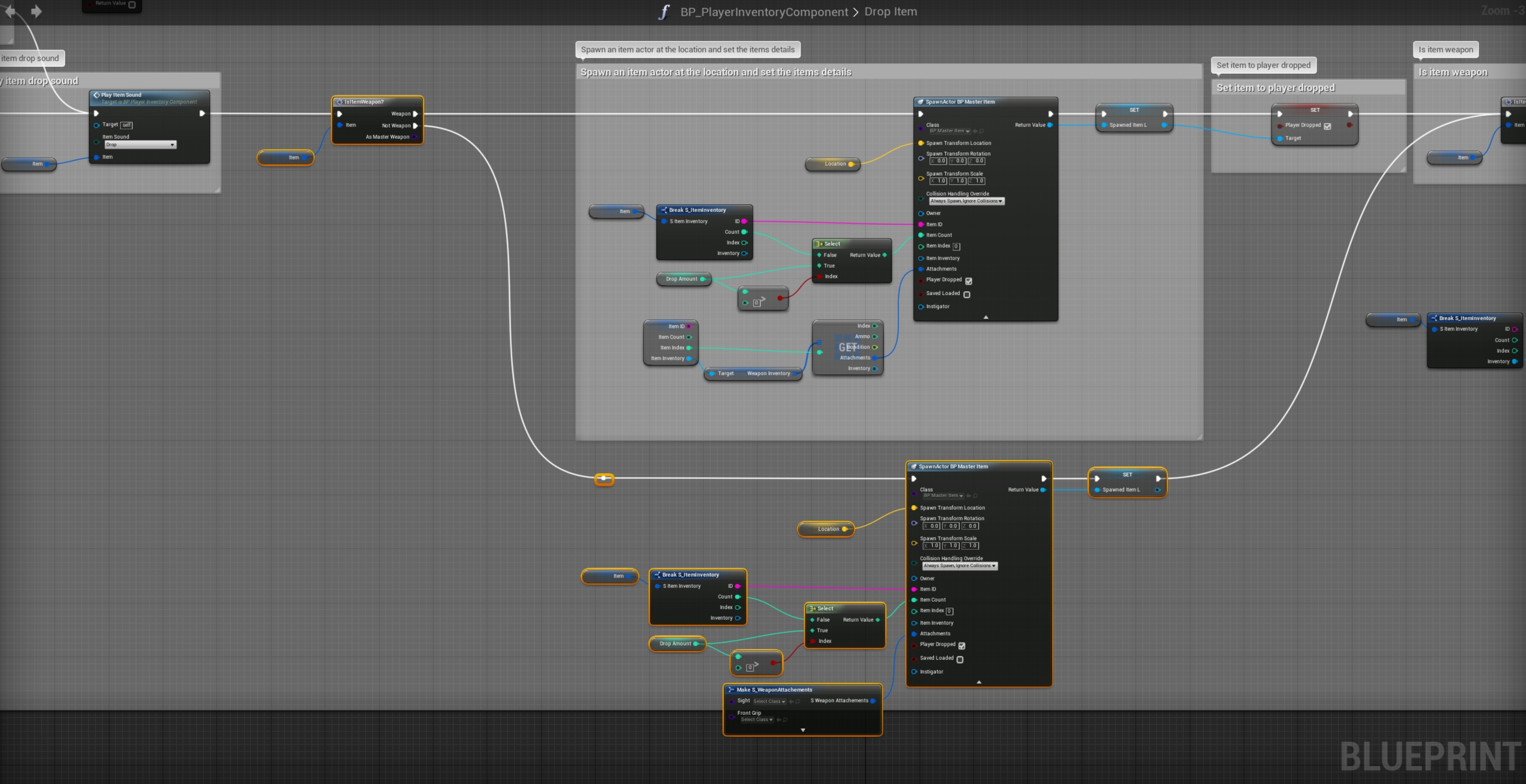 Next in the player inventory component in the Drop Item function add the highlighted nodes show in the image and tick the Player Dropped option on the spawn actor BP Master Item node. Like shown in the image below.