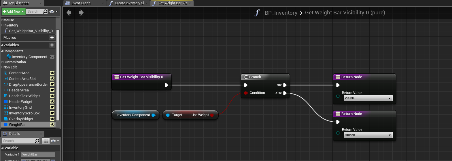 SGK – Fixed weight bar showing when weight is disabled Select the weight bar widget component and select the bind option next to the visibility options and create bind. Then in that new function copy the image below