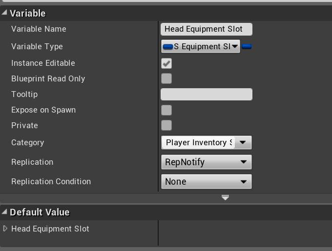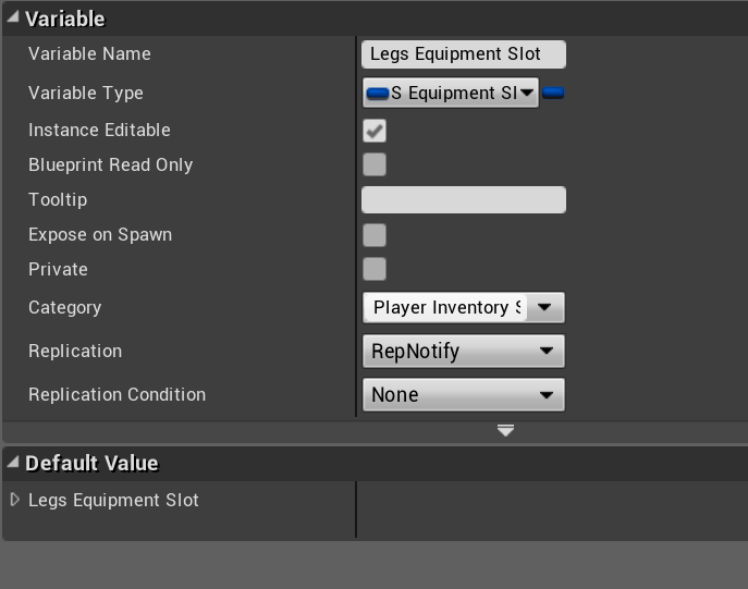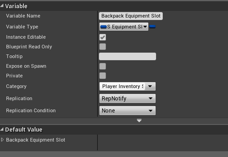 Then select and change the variables shown in the images below to RepNotify for the Replication setting. Both variables are in the BP_PlayerInventoryComponent.
