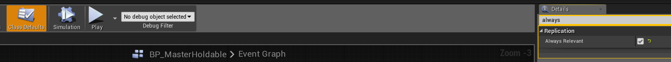 Next go to the BP_MasterHoldable and select the class defaults and search in the details for “always” then tick Always Relevant like the image below shows.