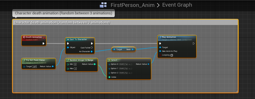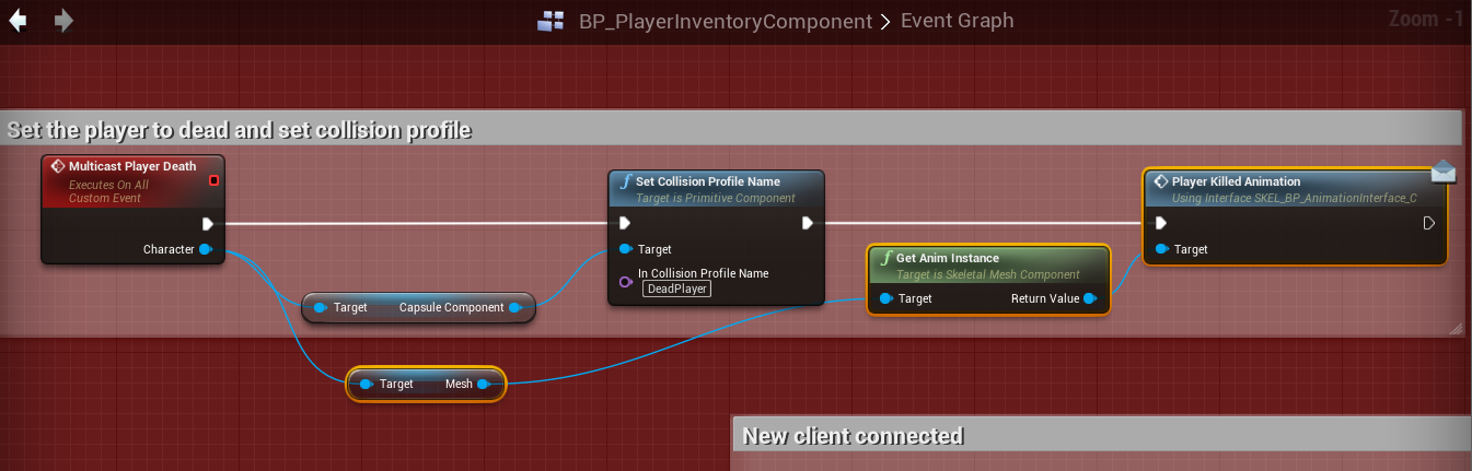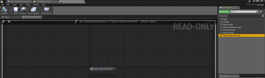 Go to BP_AnimationInterface then in the My blueprint panel select Add New and create a new function. Call it Player Killed Animation like in the image below and compile and save.