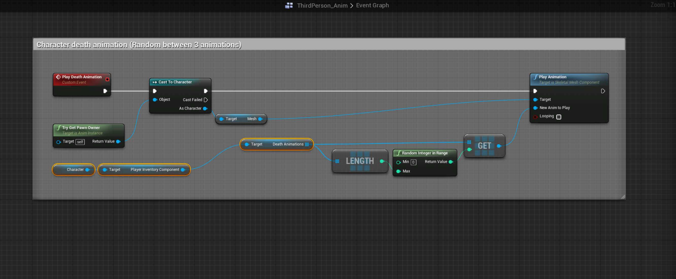 Next go to the ThirdPerson_Anim bp and add the highlighted nodes shown below. After doing this you can delete the “Death Animations” variable in the my blueprint panel in the ThirdPerson_Anim bp, you will get a warning just click Yes.