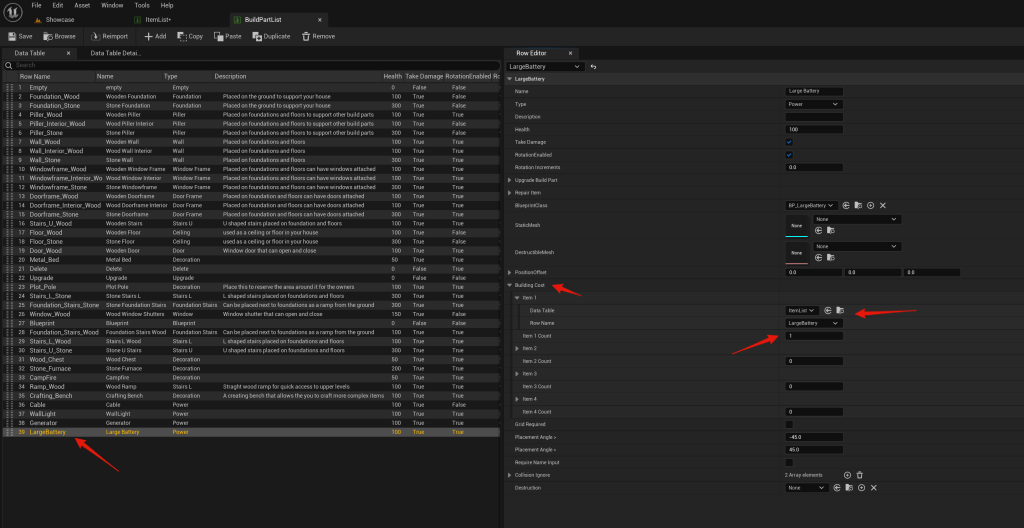 Next return to the Build Part List and select the devices row in the data table, then open the Building Cost settings, then select Item 1 and set the Data Table to ItemList, then set the Row Name to the entry you just added to the ItemList like the image below. You can also set the Item 1 Count of that item required to place the device.
