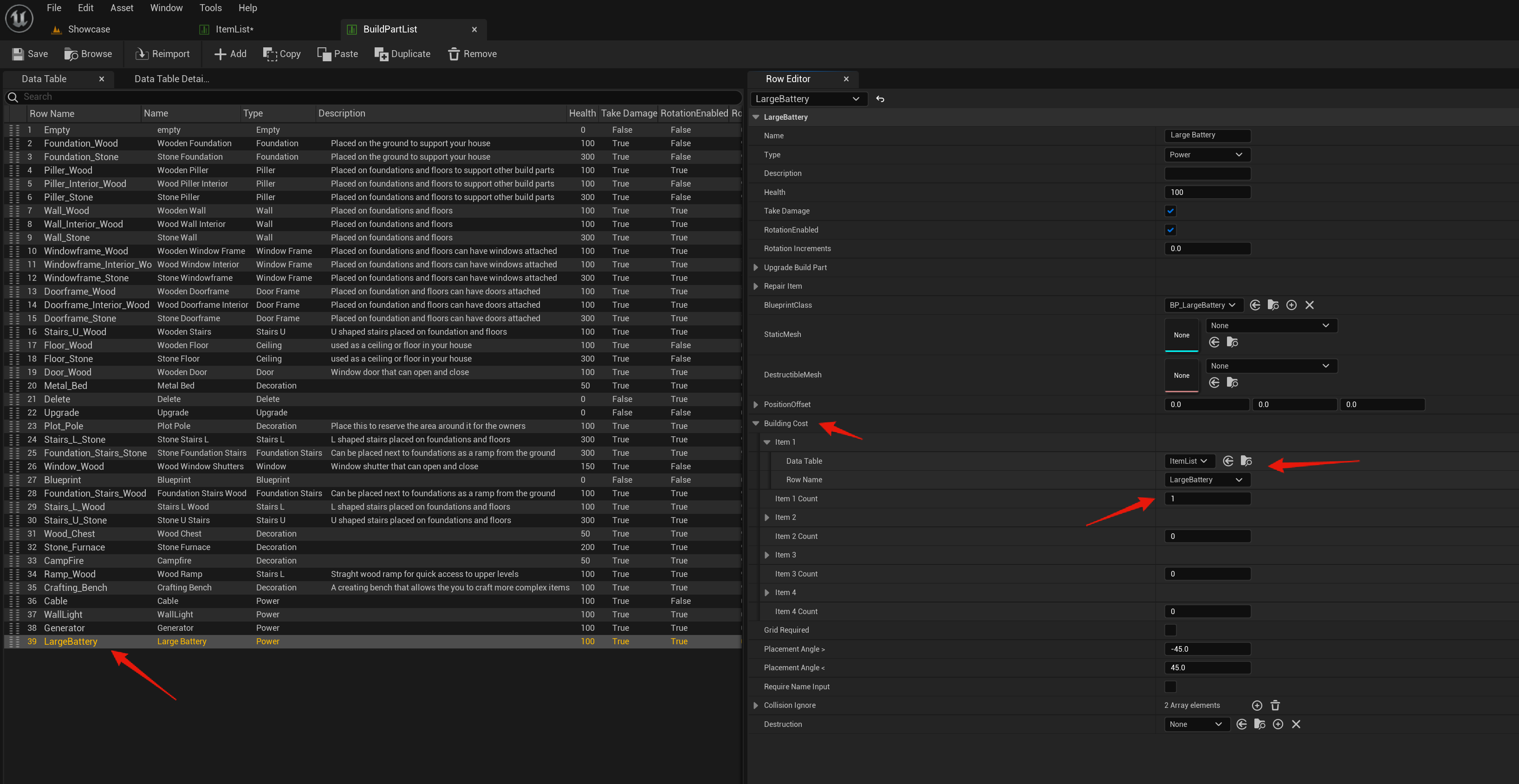 Next return to the Build Part List and select the devices row in the data table, then open the Building Cost settings, then select Item 1 and set the Data Table to ItemList, then set the Row Name to the entry you just added to the ItemList like the image below. You can also set the Item 1 Count of that item required to place the device.