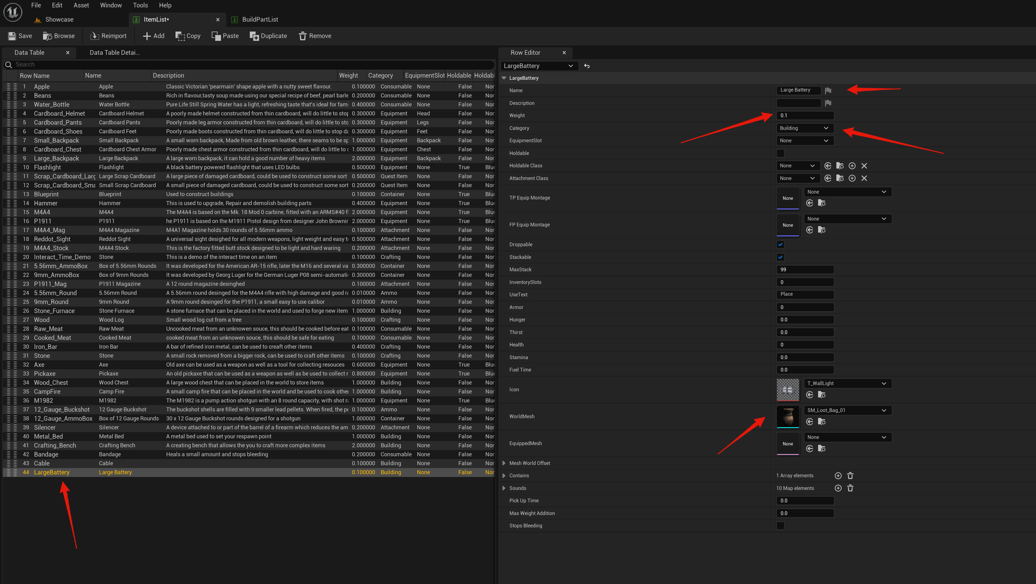 Your Row Name in the ItemList MUST be the same as the Row Name of the build part in the BuildPartList!