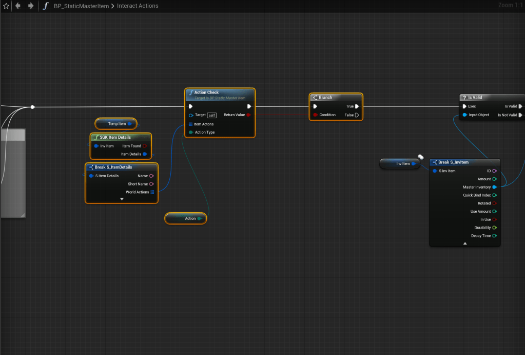 Go to the BP_StaticMasterItem and create a new function called ActionCheck then add an input to it called ItemActions and set its type to S_WorldAction and set it to an array. Then add another input called ActionType and set its type to E_WorldAction.