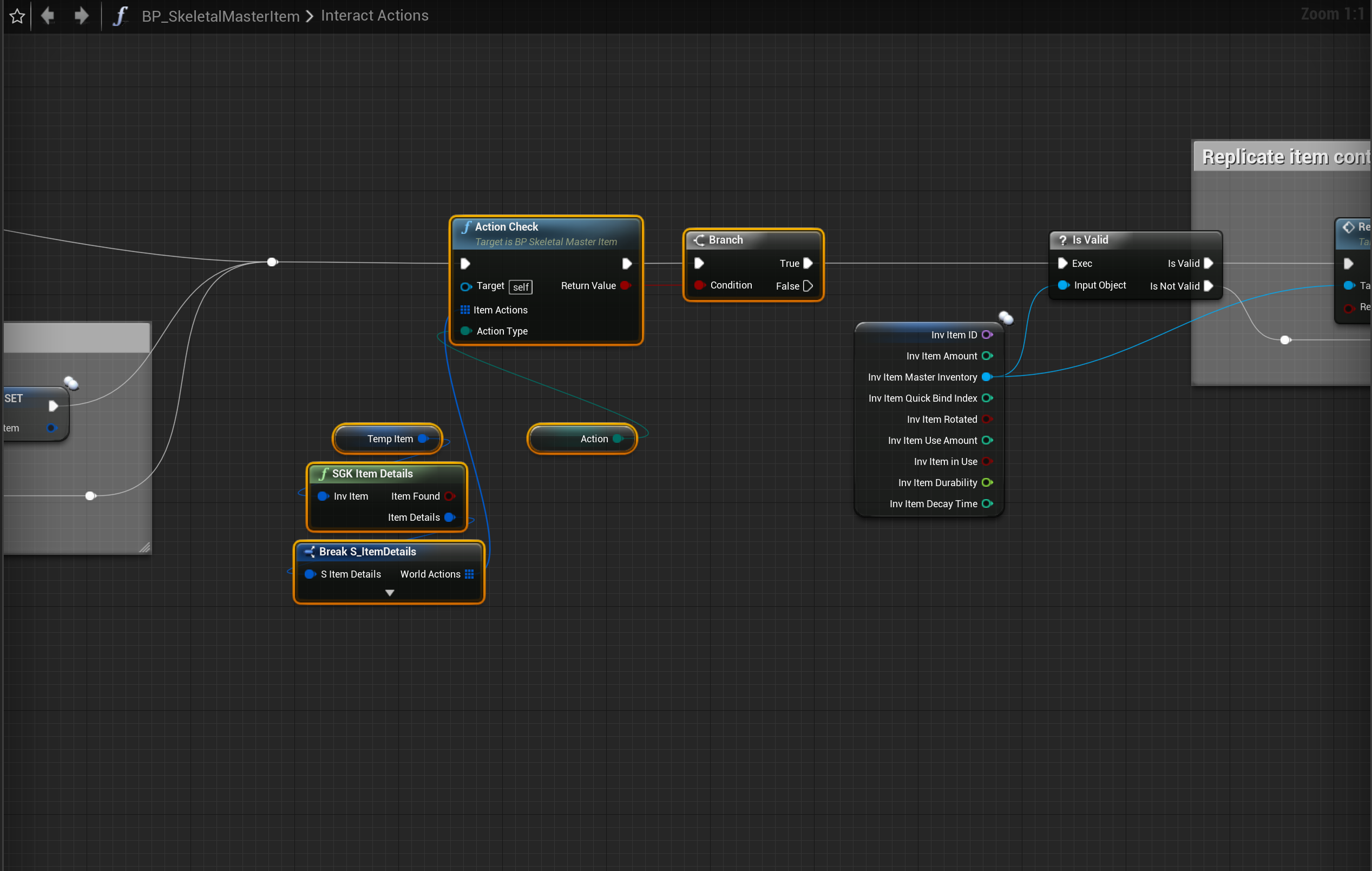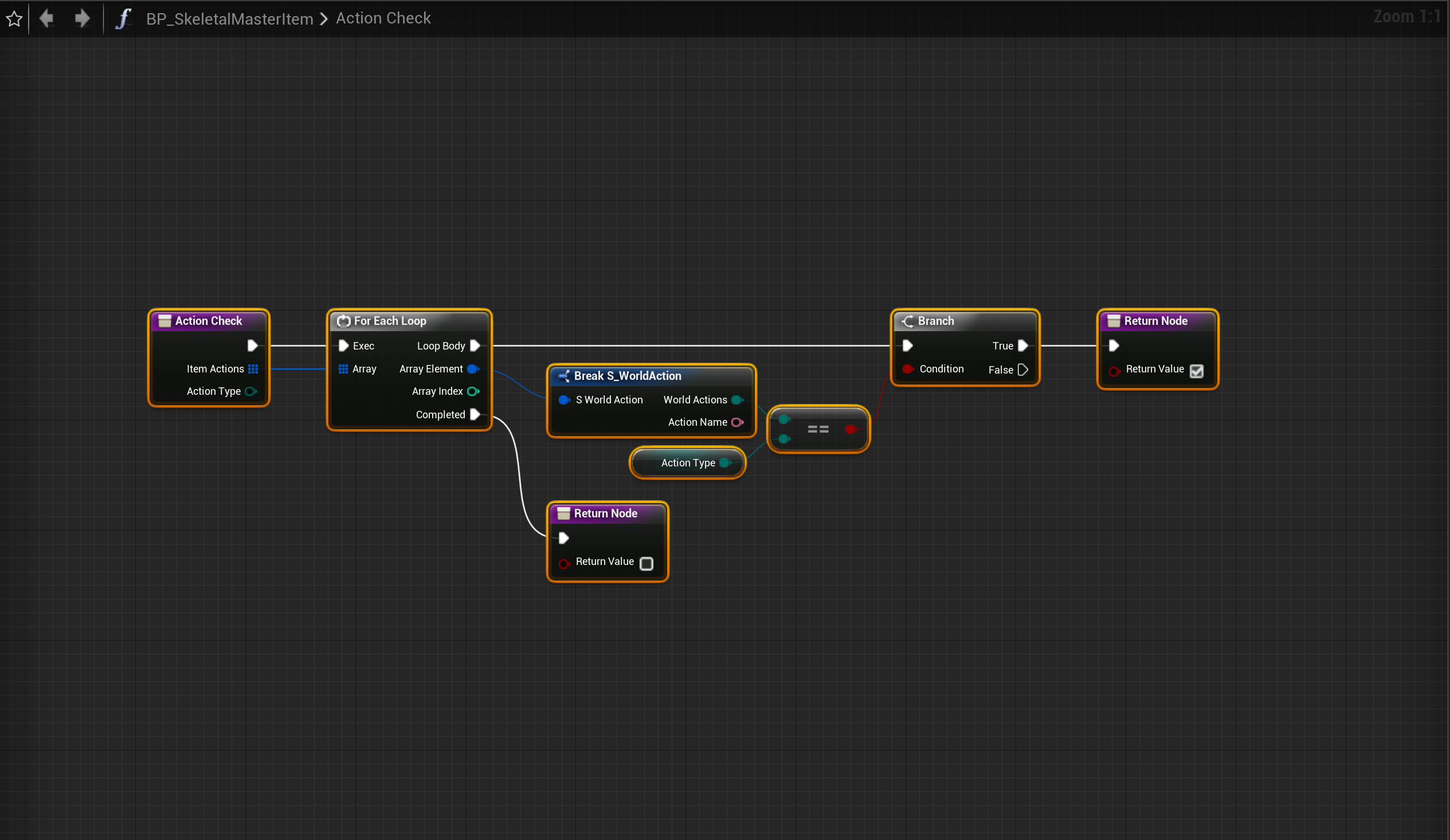 Go to the BP_SkeletalMasterItem and create a new function called ActionCheck then add an input to it called ItemActions and set its type to S_WorldAction then set it to an array. Then add another input called ActionType and set its type to E_WorldAction.