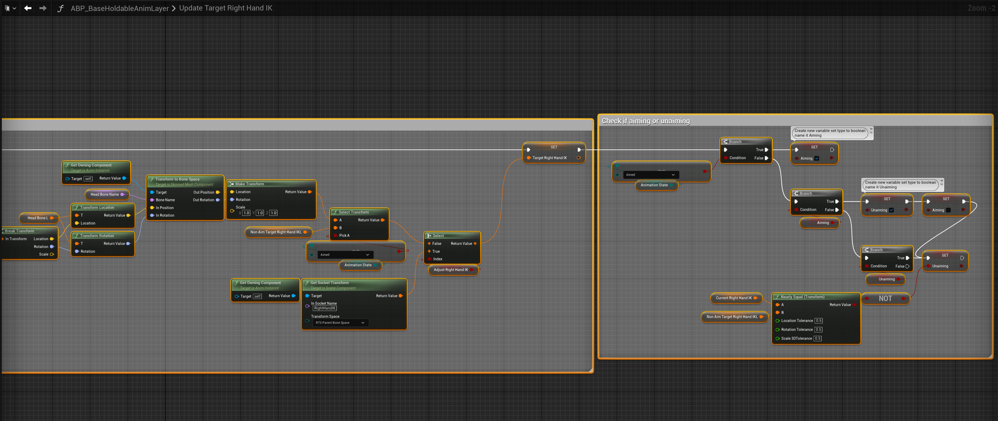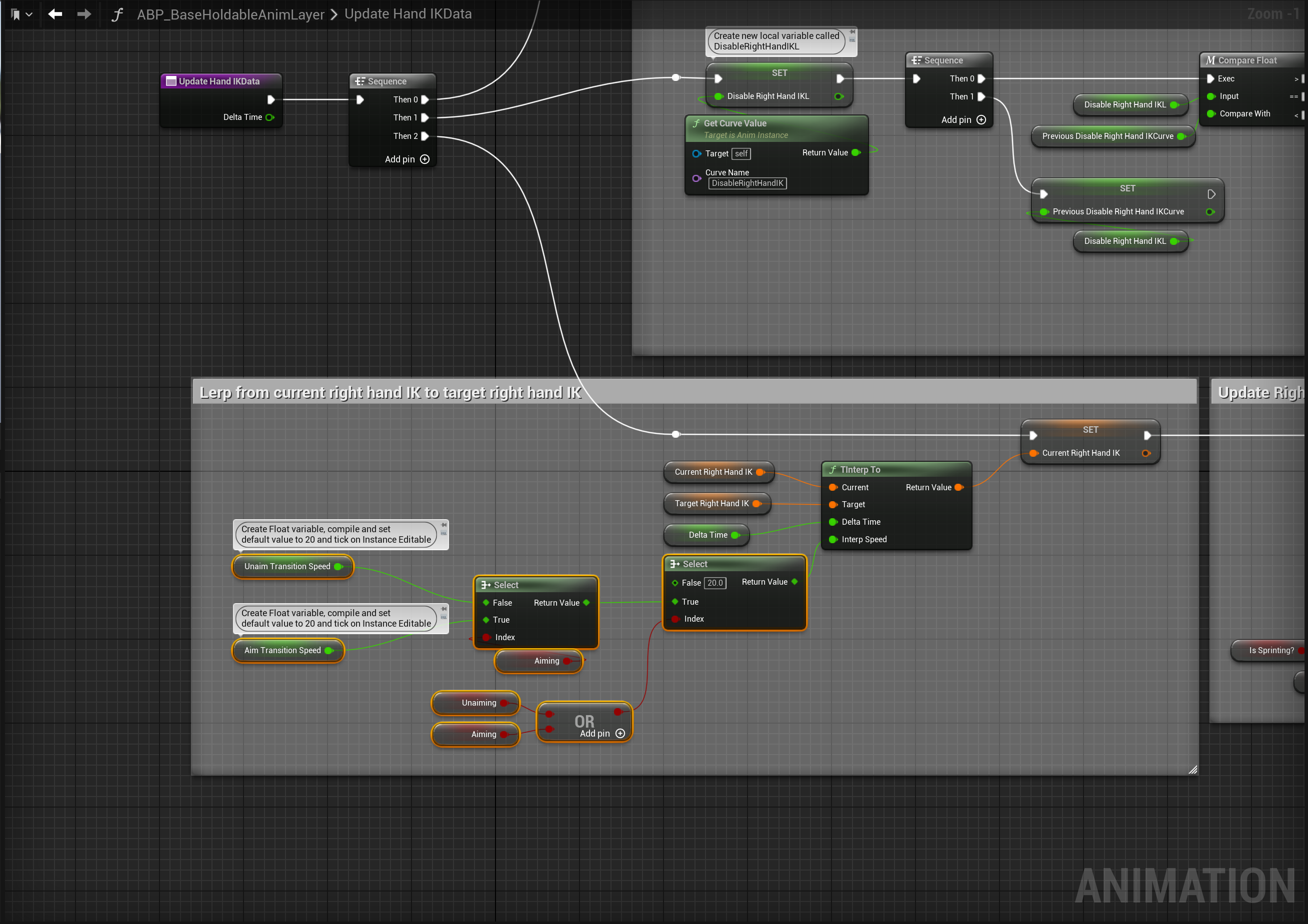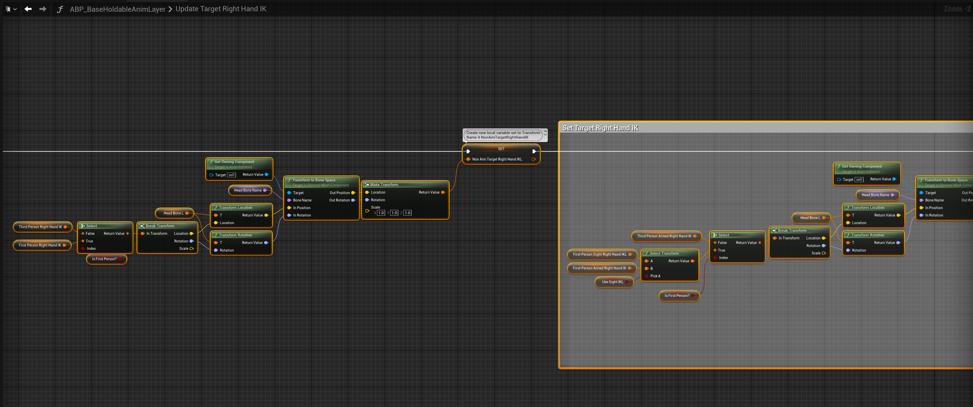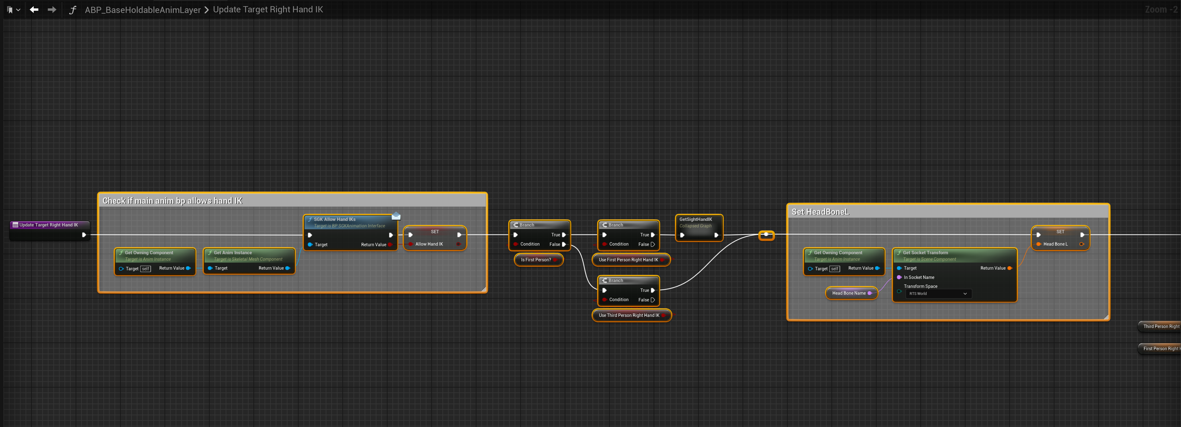 Open the ABP_BaseHoldableAnimLayer blueprint then open the UpdateTargetRightHandIK function and copy the images below. You will already have the GetSightHandIK collapsed node in this function, reuse that node.