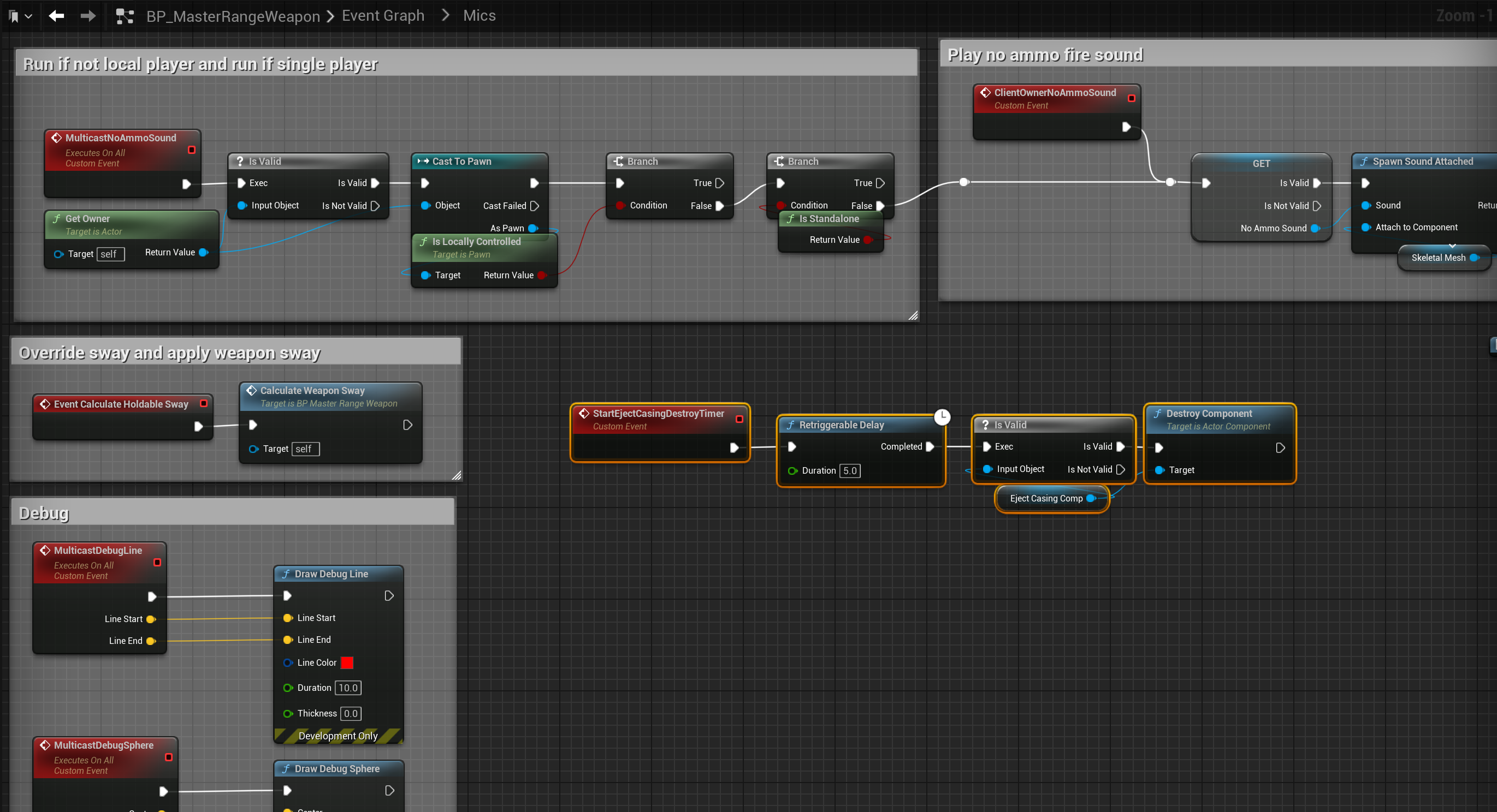 Next open the Mics collapsed node in the BP_MasterRangeWeapon, create a new custom event called StartEjectCasingDestroyTimer and copy the image below.
