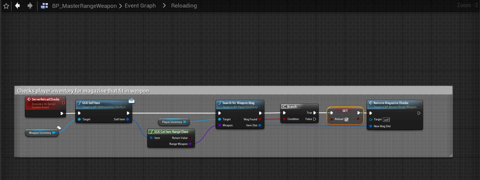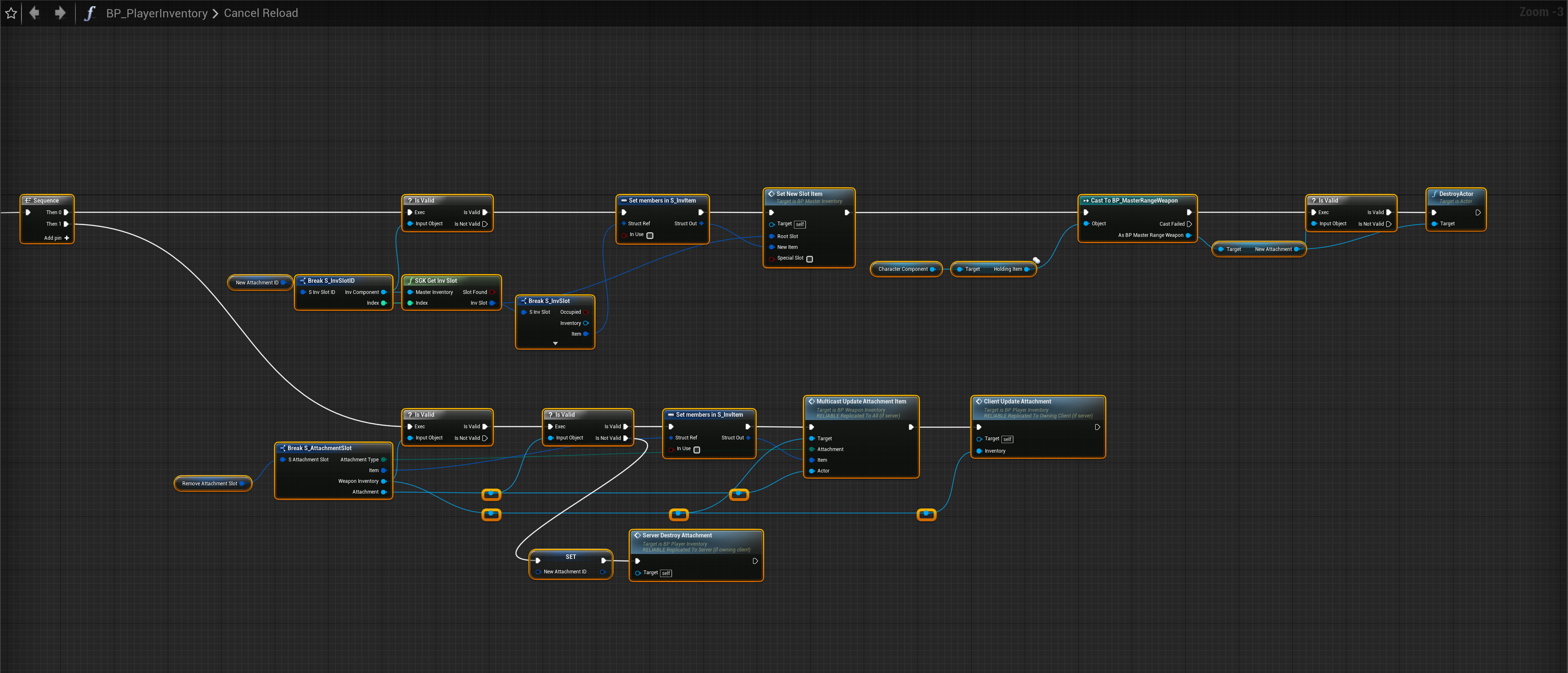Next go to the BP_PlayerInventory and create a new function called CancelReload then copy the images below. To get the In Use pin on the Set members in S_InvItem node select it and in the details panel tick on the In Use option.