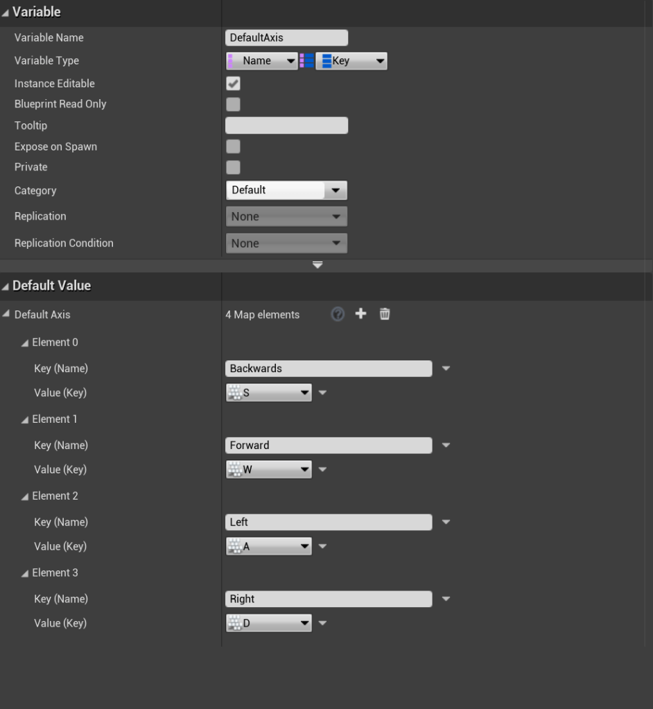 Next select the DefaultAxis variable and in the details set the Defaults Values shown in the image below. To add new entrys to the defaults values click the + button. The Key (Name) variables must be identical to the image below.